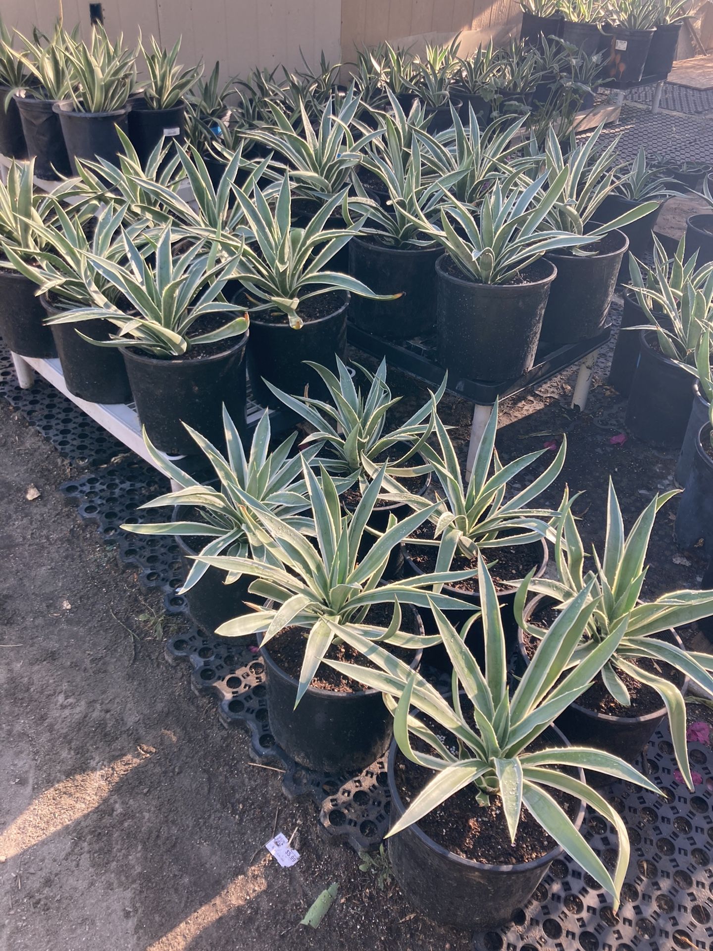7 gallon size pot that measures 11.5 tall by 15 inches wide. The plant measures about 24 inches wide by 24 inches tall.Beautifully healthy plant shipped bare root if not local. Variegated plant with white outer stripes and deep green on the inside.Low water and maintenance needs. Exotic.