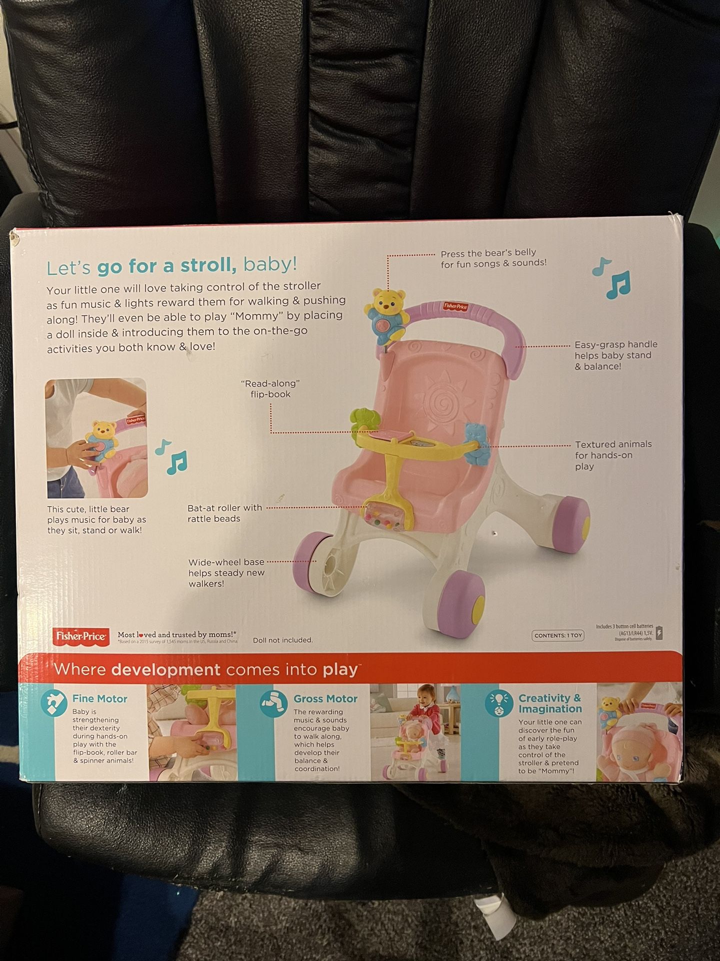 New Still In Box, Never Opened. • Sturdy pretend stroller steadies baby’s first steps • Music plays as baby walks along, or when baby presses the wiggly bear’s belly • Hands-on activities include spinners, roller bar and flipbook • Adorable stroller styling encourages early role play and nurturing