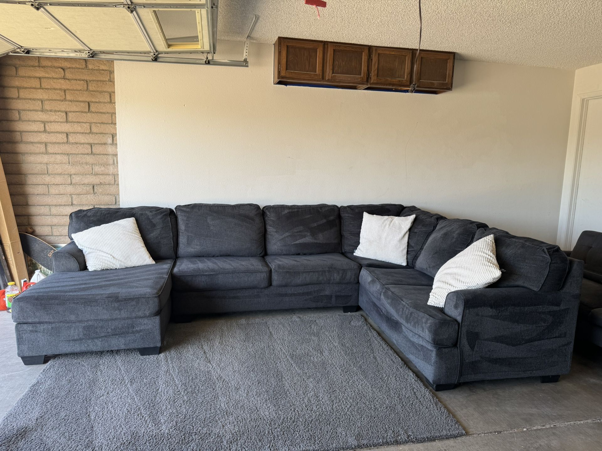 144”x92”x65” chaise This 3 piece sectional sofa from Ashley’s furniture is less than 1 year old but in excellent condition Pet free smoke free No rips no tears Only bottom cushsions are removable Asking $750 Will deliver