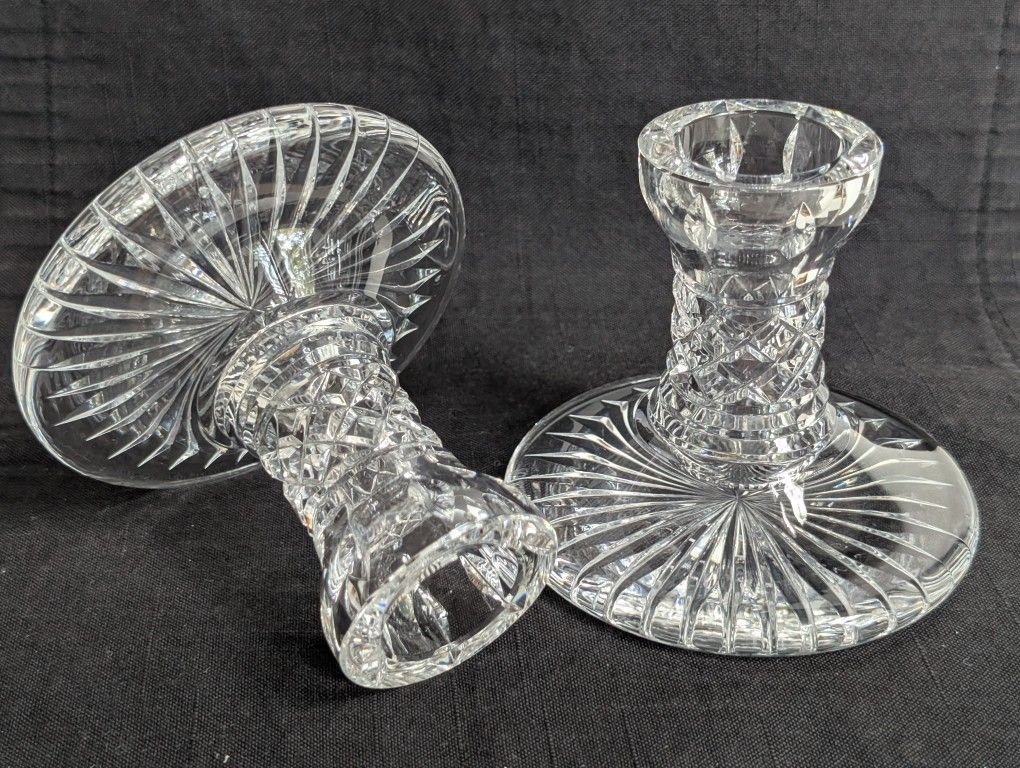 Pair of Waterford Heavy 4" Diamond Cut Crystal Taper Candlestick Holders with Starburst Base Excellent pre owned condition with slight signs of wear from age. Please review all the photos for exact condition description. Msg for any questions before you pay. Smoke Free & Pet Free Home. ☆☆Bundle with other items to Save ☆☆ We use recycled packaging when available ☆☆Thanks for stopping by!