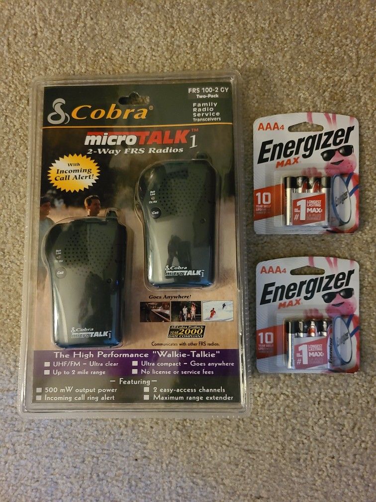 Cobra microtalk two-way walkie talkies with batteries. Brand new. This will be great if you go camping or any outdoor function and want to communicate not worrying about do I have a signal or not
