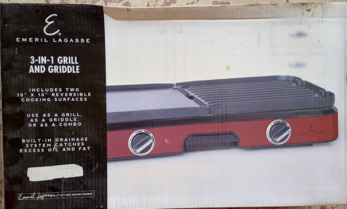 Emeril Lagasse 3-in-1 Grill & Griddle - Includes two 10" x 10" reversible cooking surfaces - use as a griddle, a grill or a combo - built in drainage catches excess fat I have 200+ items posted, so check out my other stuff! . . . . frying, skillet, pots, pans, dishes, dishware, cookware, bakeware, cooking, collection, spatula, cooking, stove, stovetop, nonstick, pot, cake, bread, baking, bake