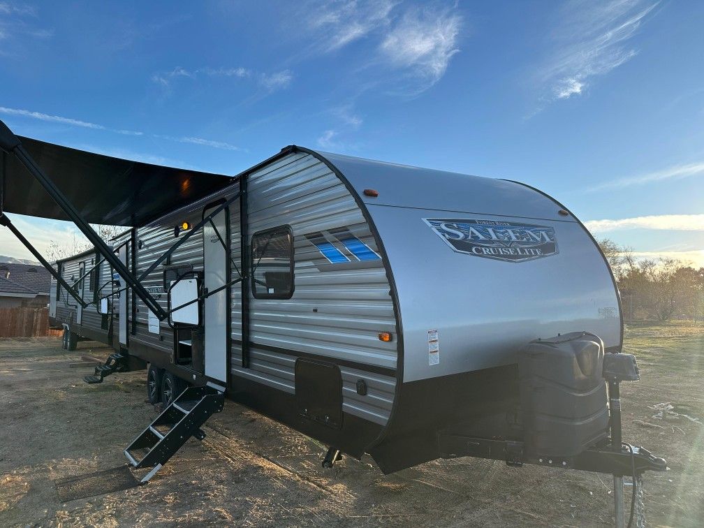 Hello there , se habla español. Selling privately - privado - OBO NO TRADES - NO CAMBIO - !!! FULLY - FUNCTIONAL !!! LIKE NEW -PRIAVE SELLER/VENDO PRIVADO Located In HESPERIA CA 2022 Salem edition new TITLE: Salvage I believe due to Vandalism. SOLAR CONNECTION: ✅ BUNKS: 2 ✅ XL 1 SLIDE OUT ✅ DUERME/SLEEPS : 8 ✅ BEDS/CAMAS TOTAL : 5 ✅ All Electric awning 1 chimenea Sonido 1 AC + Electric chimney + Heater ✅ ALL FULLY FUNCTIONAL /READY TO GO ! Locación en Hesperia cA MAs INFO BELOW. SALEM EDITION NICE Title: Salvage title in hand . Todo functional ! GVWR: 6200 BOX LENGTH : 28FT Total trailer Length : 30 Camas/BEDS : 5 ✅ Sleeps/Duerme : 9 Queen bed : 1 Sofa futon : 1 Rear Bunk beds / literas : 2 Table dinette cama: 1 Orno/Oven : 3 burners and oven combo Awning / sombra : 1 electric ✅ Electric leveling- niveles ✅ Radio speakers inside - outside 30AMP power Hitch ball is 2 . 5-16th V8 TRUCK IS RECOMMENDED TO HAUL. 2022 SUPER NUEVA y en buenas condici