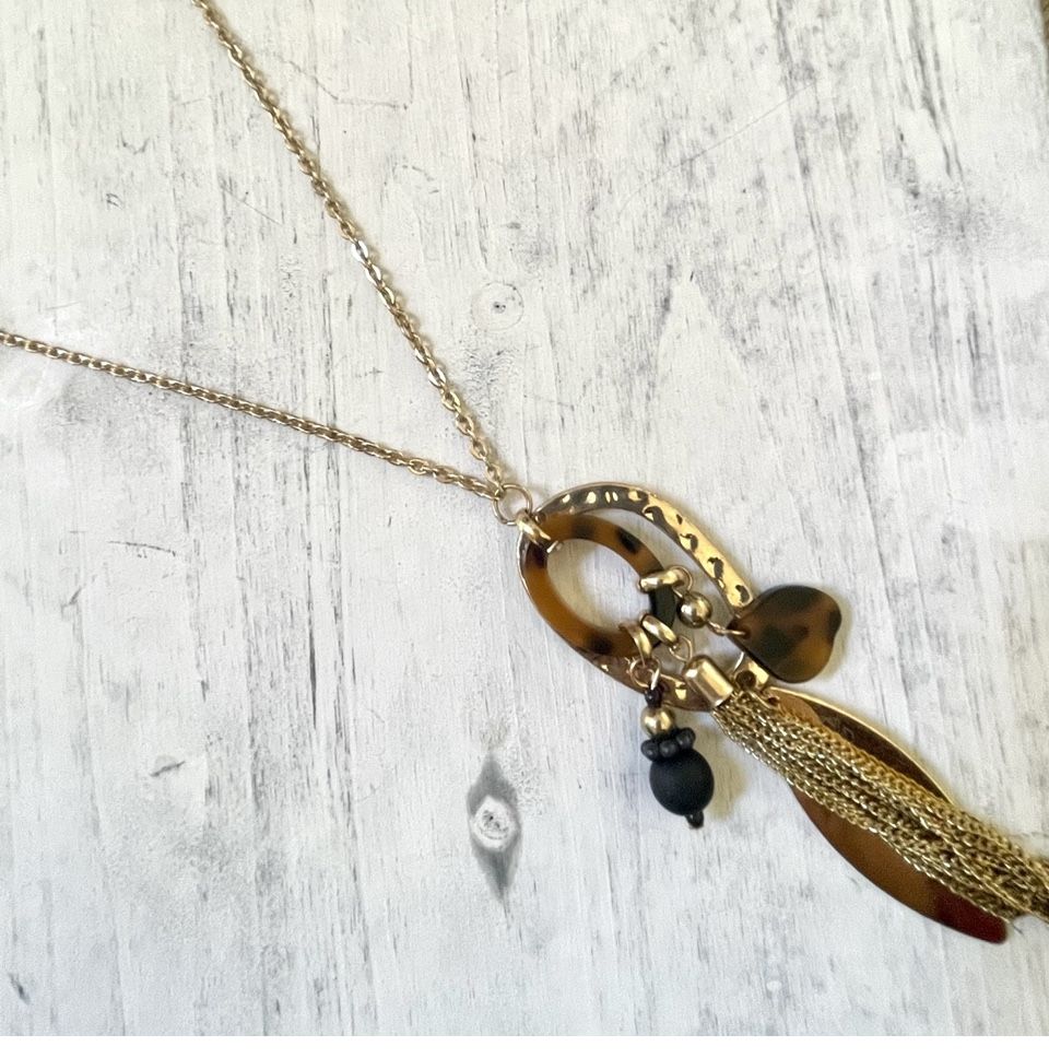 Long gold tone necklace Leopard, black and gold tone Charms Chain Tassel EUC Always open to reasonable offers Bundle to save Fast shipping Feel free to ask any questions Please see photos for details