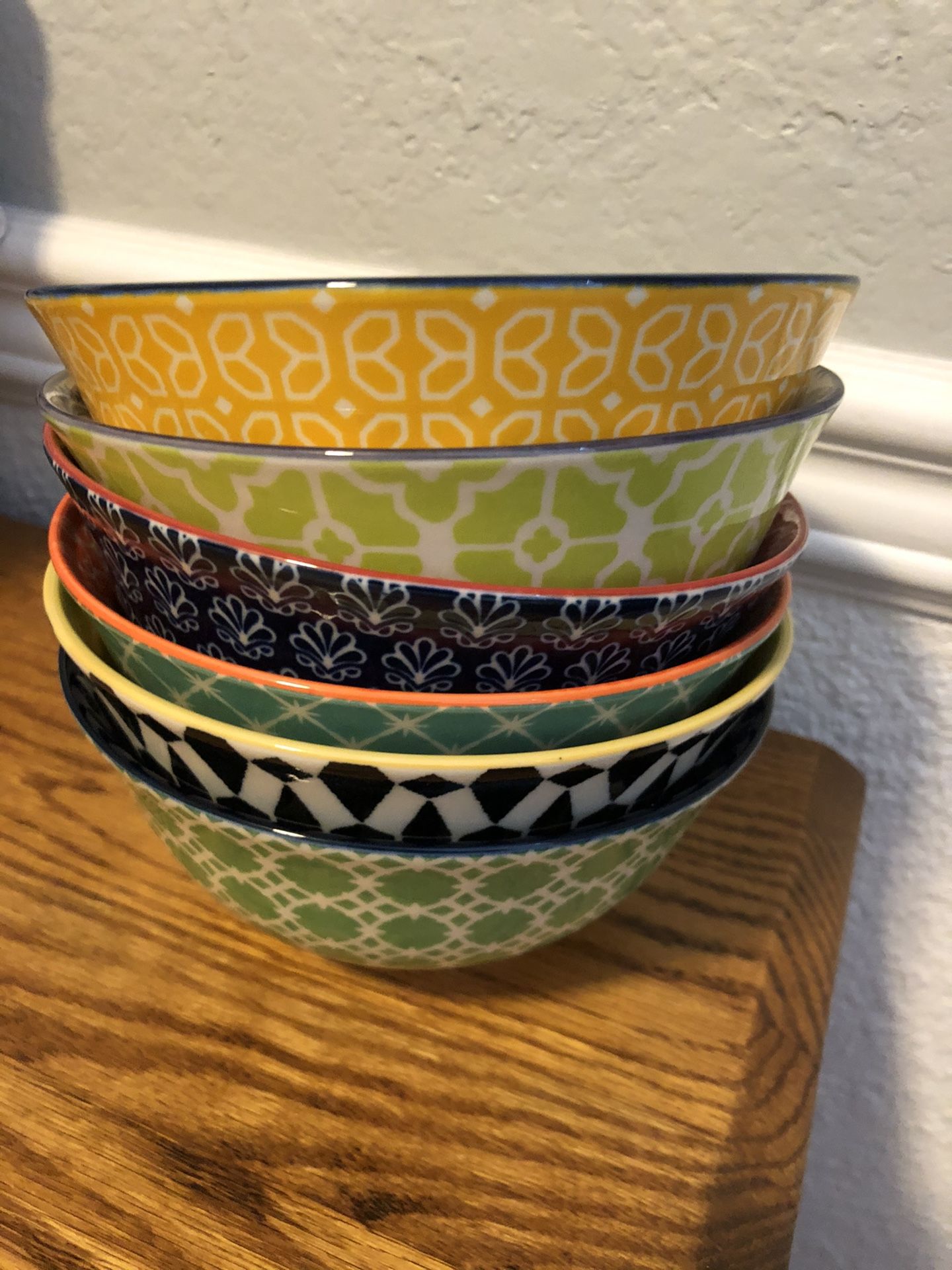 Set of 6 brightly colored stackable cereal or all purpose bowls. Used, like new; no chips, cracks or damage.