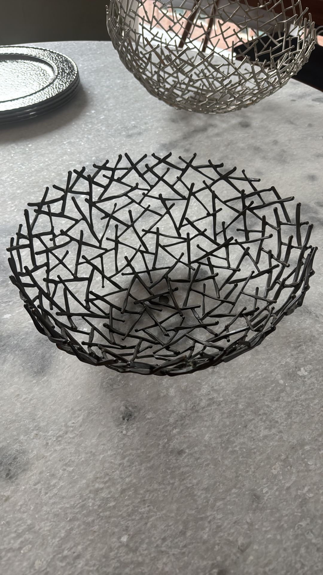 Michael Aram Metal Work Twig Bowl Bring a bit of nature into your home with this exquisite contemporary style bowl, designed by Michael Aram, it is a stunning addition to any home décor. The Thatch pieces are inspired by the random beauty of nature.. Each pieces is hand forged and welded, with no two are exactly alike. Crafted from high-quality metal and finished in a rich silver color (which I believe is nickelplate), this bowl is perfect for serving food or displaying decorative items. The unique thatch, twig or nest design of the bowl adds a unique and interesting touch to any room. This bowl is about 11" D. Signature on the bottom of the bowl. I do not see any defects. Unique metal bowl with intricate design. Perfect for modern decor.