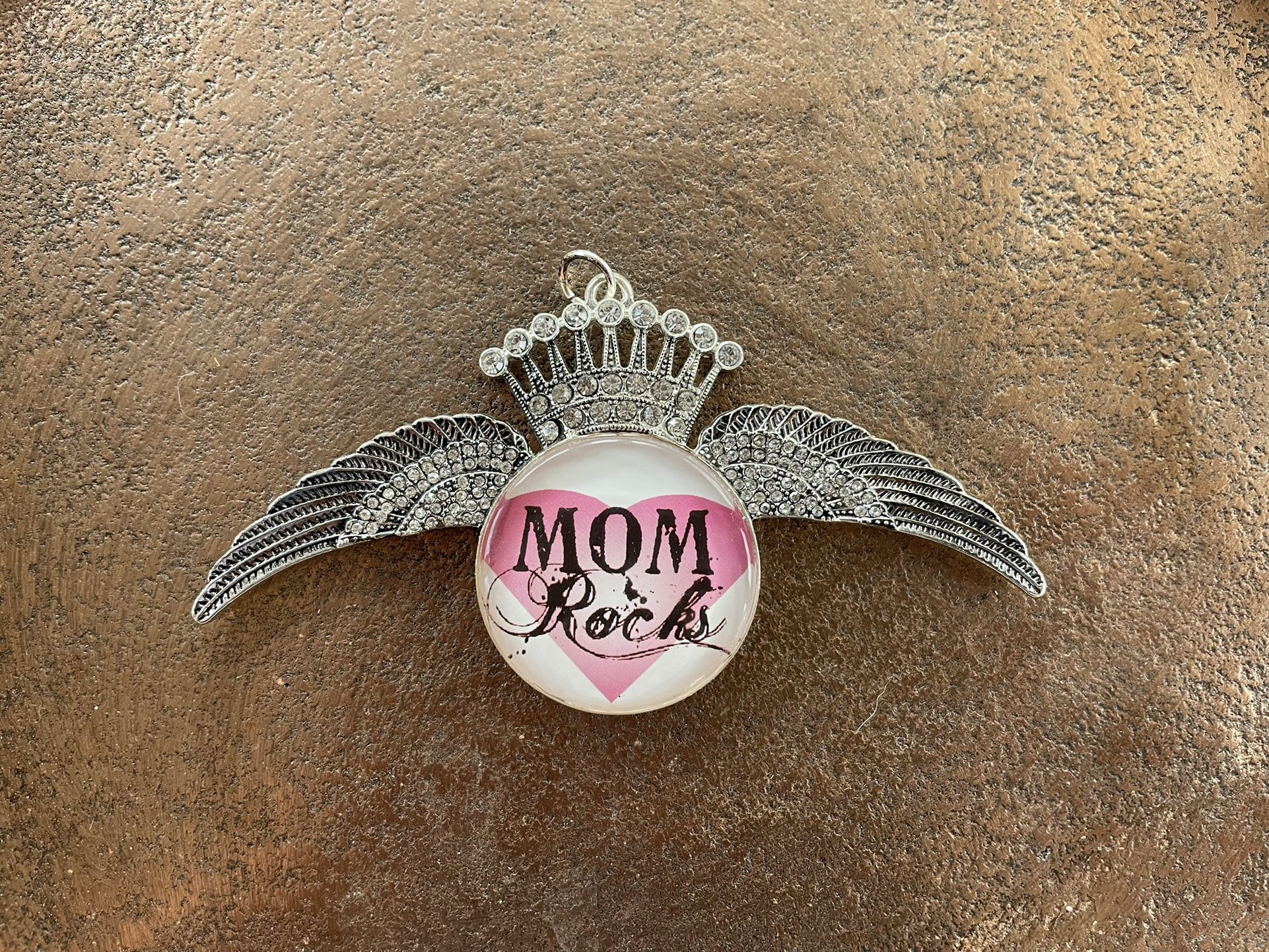 Mom Rocks necklace pendant has a bubble center with pink heart and “Mom Rocks” encapsulated in it. It has bedazzled wings and a crown to show how strong, independent, and fierce Mom really is. Would make a great gift for Mothers Day, Birthdays, Holidays, or for yourself to remind you how great you are at being a Mom. Pendant measures 2.5” tall from crown to emblem, and 4.5” wide from wing tip to wing tip. The pendant is heavy and would need to be added to a heavy necklace, or could be turned into a broach.