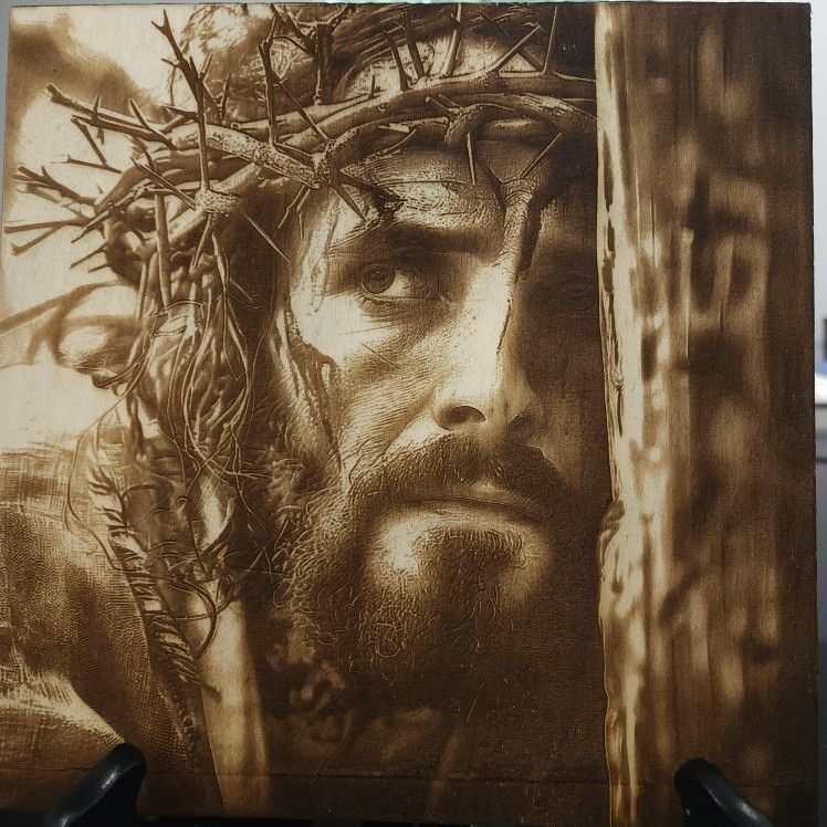 This is a laser-engraved image of Jesus Christ, depicting Him wearing a crown of thorns, which symbolizes His suffering during the crucifixion. The engraving highlights fine details, such as the texture of the thorns, His facial expression, and the wood of the cross beside Him. The artwork focuses on a solemn and reflective mood, emphasizing the emotional depth of the moment. Small: 224mm Square $60 Large: 14x18 inch $150