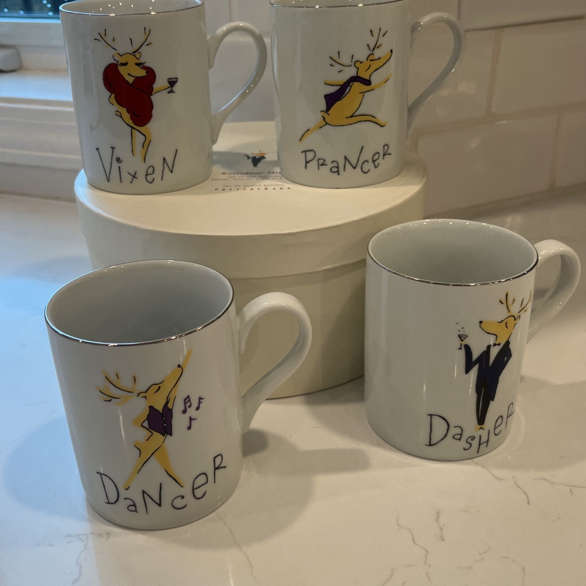 Pottery barn dancer, dasher, prancer, vixen mugs cups