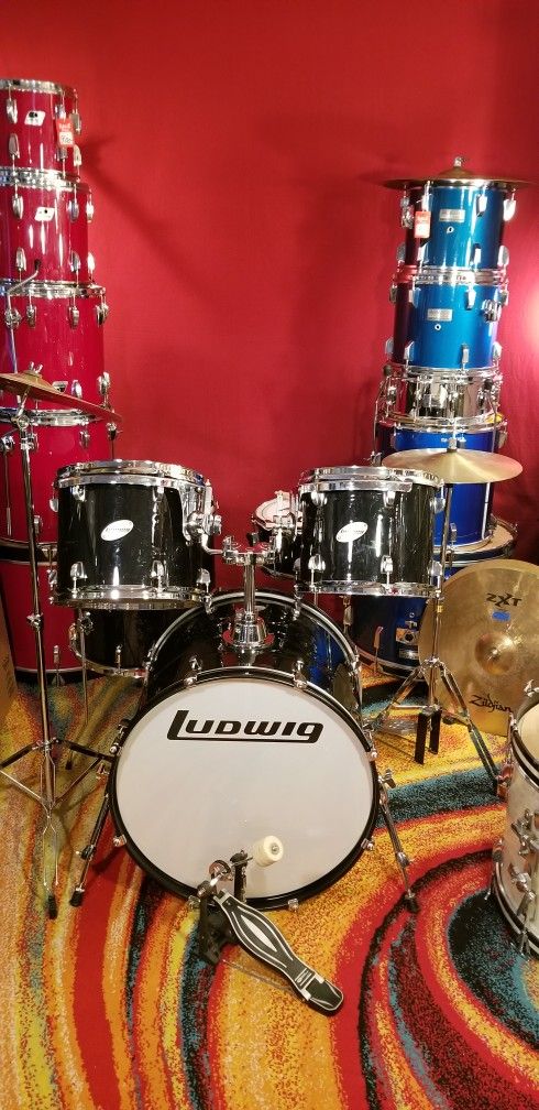 Five piece Ludwig full size black complete with all stands cymbals pedals sticks and tuning key. Drum sizes are 12 1314 16 22. 16 Ride/crash cymbal 14 hi hat cymbals. 400.00 firm Cash only No trades. Thank you