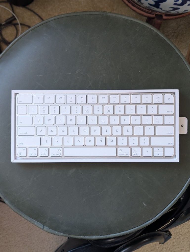 Selling an Open Box Apple Magic Keyboard. It is in perfect condition and was only taken out to check contents. This is the rechargeable model that works with any Mac running macOS 11.3 or newer. Design: Super slim, aluminum chassis, white keys. Battery: Rechargeable (no more AA batteries!). Condition: Mint condition, includes original box. Great for a clean desk setup or for use with an iPad. Note: Does not include lightning cable.