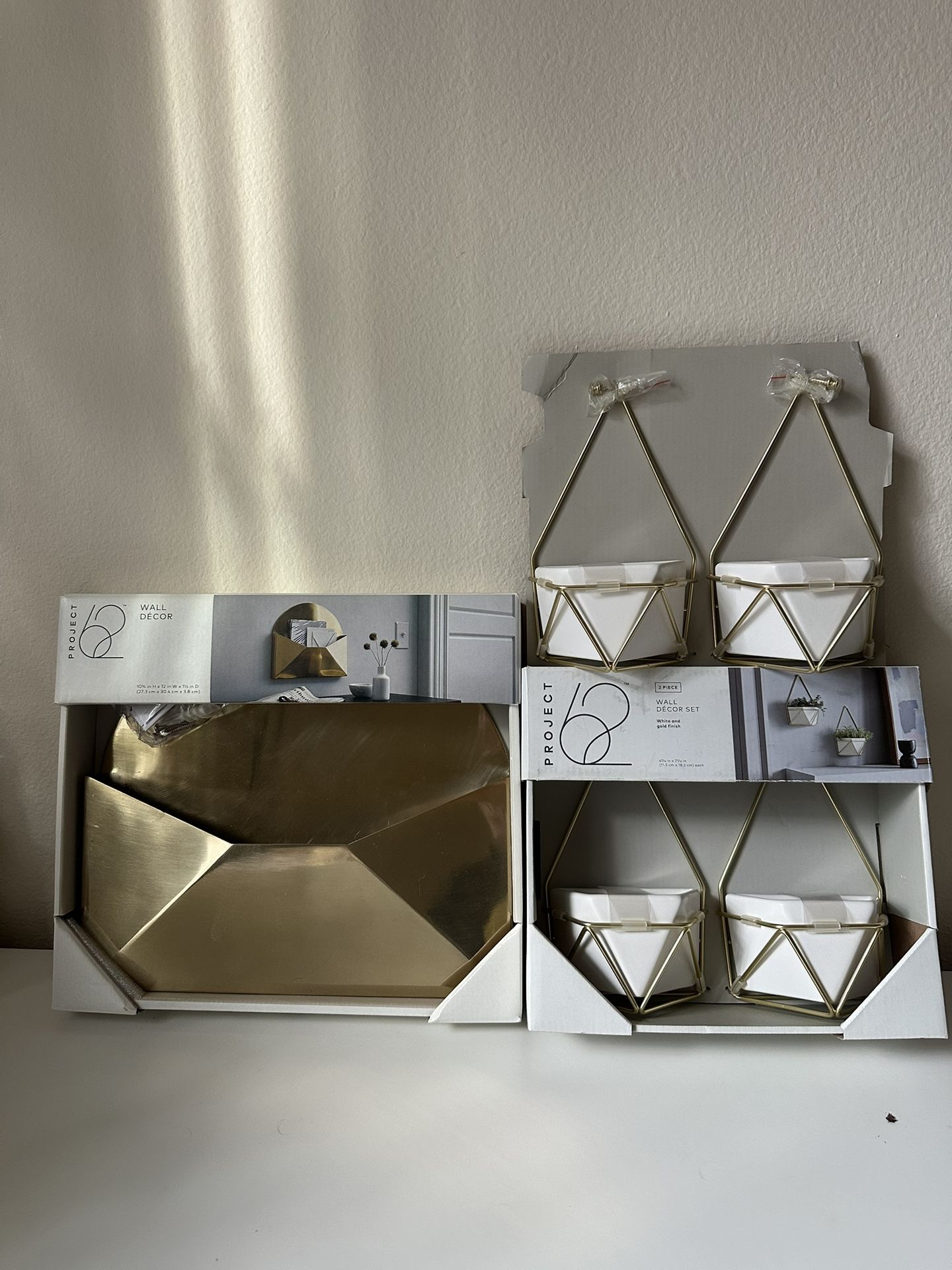 Brand new – never used. Project 62 wall decor set that includes a faceted gold metal envelope-shaped wall pocket and a set of four white and gold geometric wall planters.