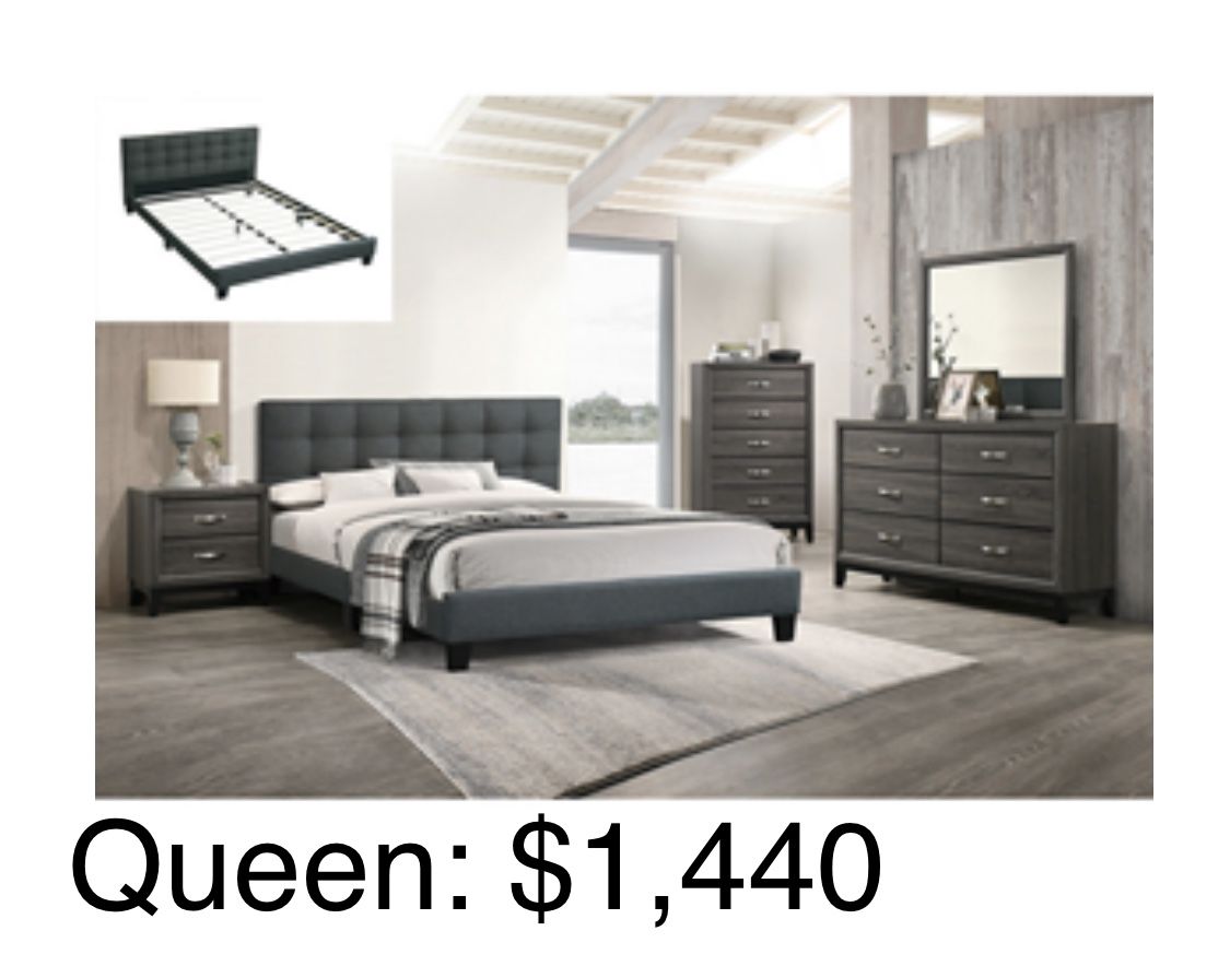 INCLUDES: Queen BED (Headboard and side rails) NIGHTSTAND DRESSER CHEST MIRROR Queen Mattress Starting at $325 PAY FULL PRICE OR PAY AN INITIAL PAYMENT OF $49 AND TAKE IT HOME!! CONTACT US TO ORDER NOW WHILE SUPPLIES LAST and SET UP DELIVERY!!! PAY TODAY OUR PRICE SHOWN OR TAKE ADVANTAGE OF OUR EASY PAYMENT PLAN: FOR THE EASY PAYMENT PLAN ONLY PAY $49 OF INTIAL PAYMENT TODAY TO TAKE HOME. FOR EASY PAYMENT OPTION: •YOU NEED ID ( SSN OR TAX ID) •MUST HAVE AN ACTIVE CHECKING ACCOUNT FROM BANK •MUST HAVE A SOURCE OF INCOME. •Se habla español!!!!