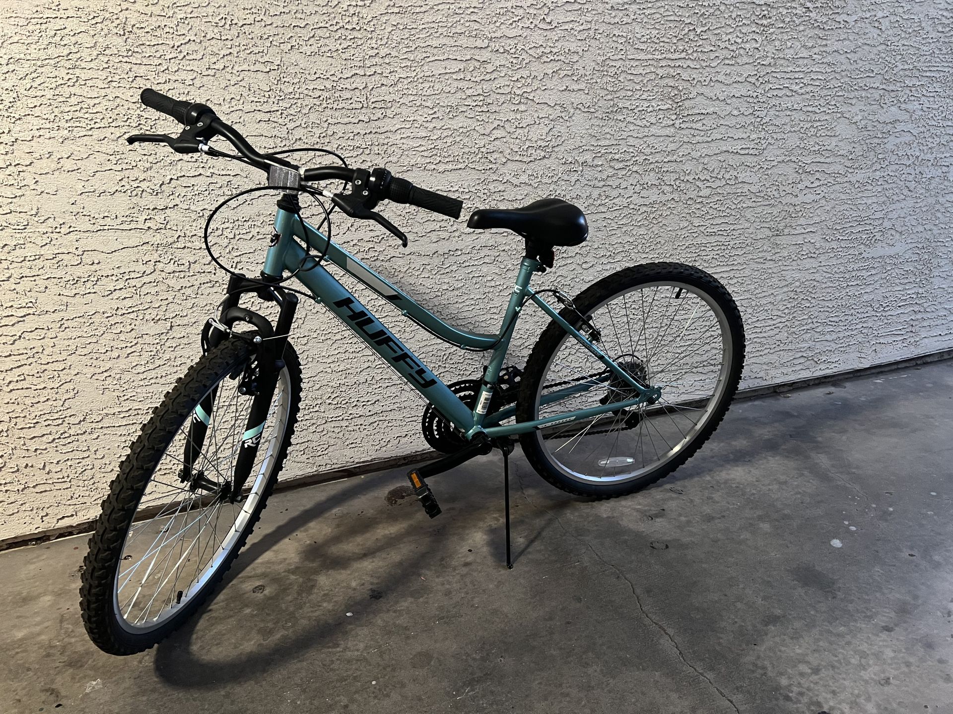 A teal Huffy Rockcreek All-Trail bike designed for comfortable cruising on roads and easy trails with dependable performance.
