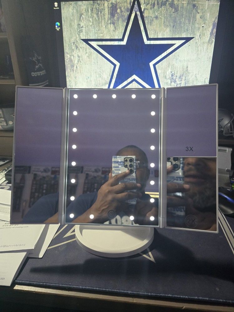 Rechargeable makeup mirror has adjustable lighting three-way magnifying on both sides the Dallas Cowboys star is just a sticker I can peel off must come pick up or meet close by