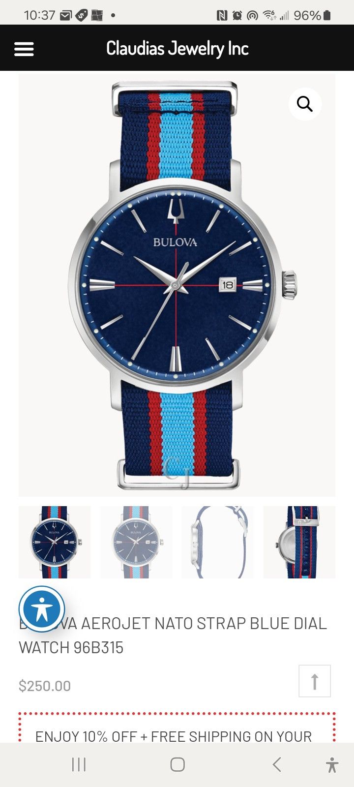New, never worn, Bulova watch. Silver tone stainless steel case and blue and red striped NATO strap with three-piece buckle closure. Blue dial with the signature Aerojet crosshair pattern. Watch features a double box mineral crystal, quartz movement, and water resistance to 30 meters.