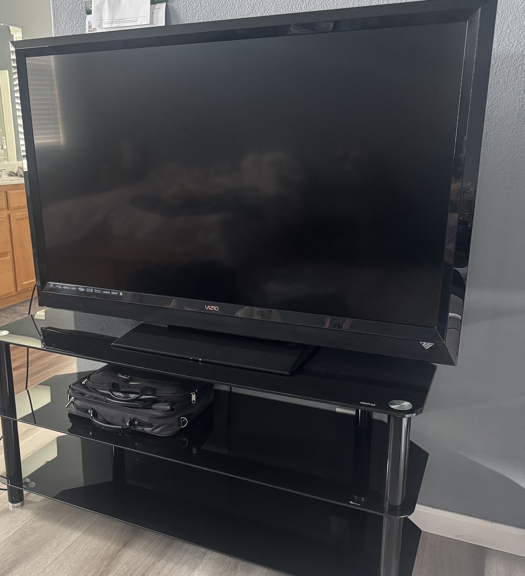 55” screen 60” TV remote control and 3 shelves black glass stand in really good condition.