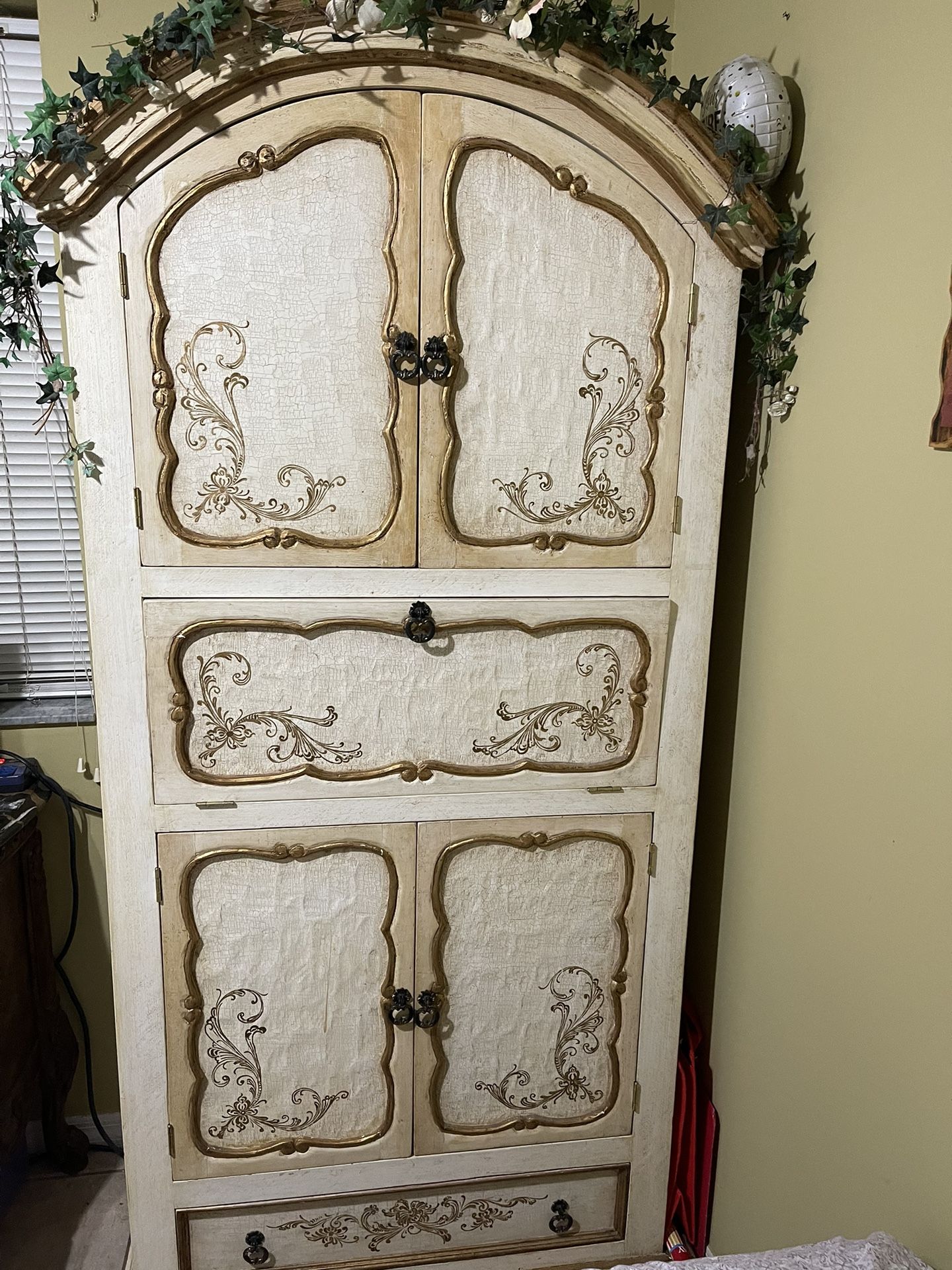Provincial Hand Painted Solid Wood ARMOIRE Very Good Condition ,painted ivory on front doors and 2 sides. Doors fully open and Fine quality. Solid construction.75”H x38”W x 18”D.
