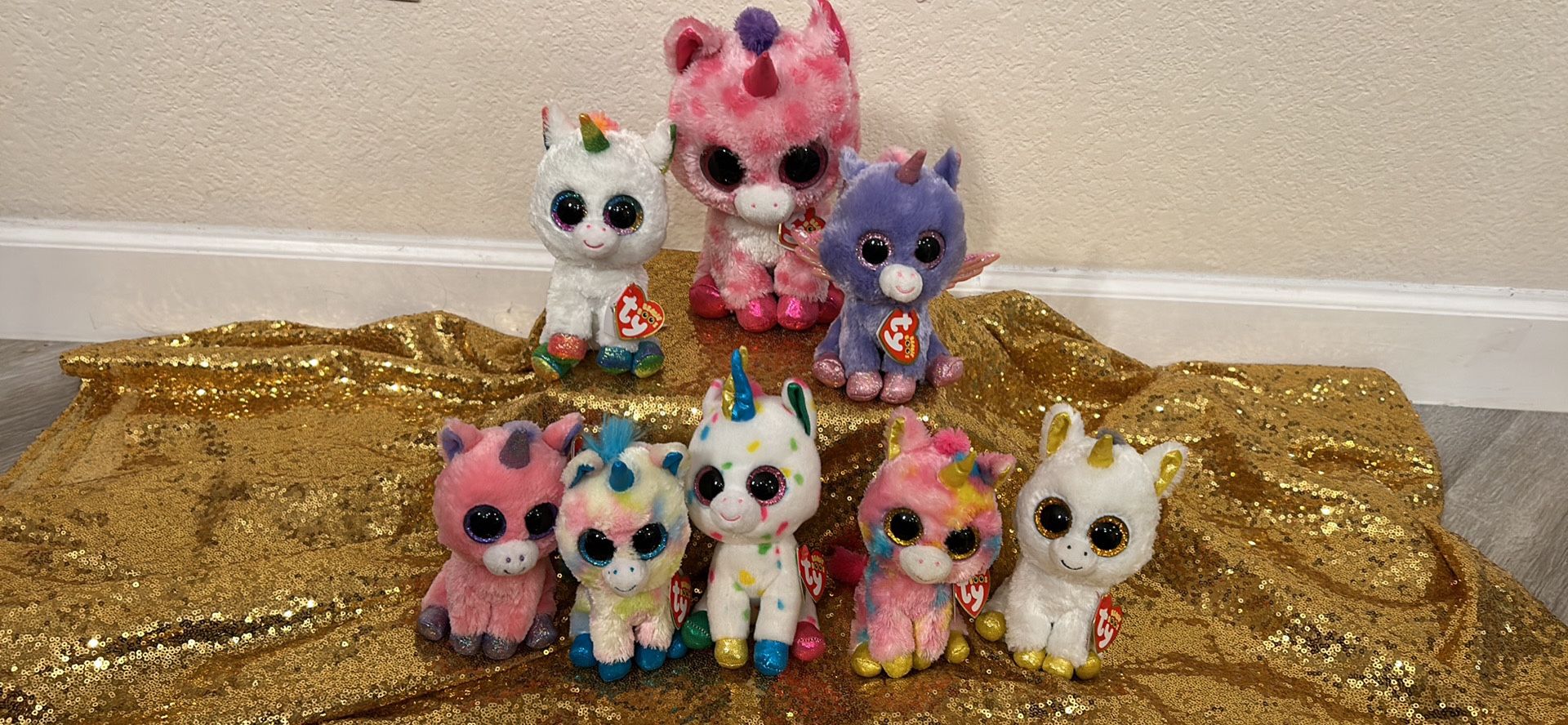 Daughter is selling her collection before she leaves for college. This bundle includes; Magic, Blitz, Harmonie, Fantasia, Pixy, Pegasus, Athena, and Sugar Pie All beanie boos are in GREAT condition non smoking house, tags are attached.