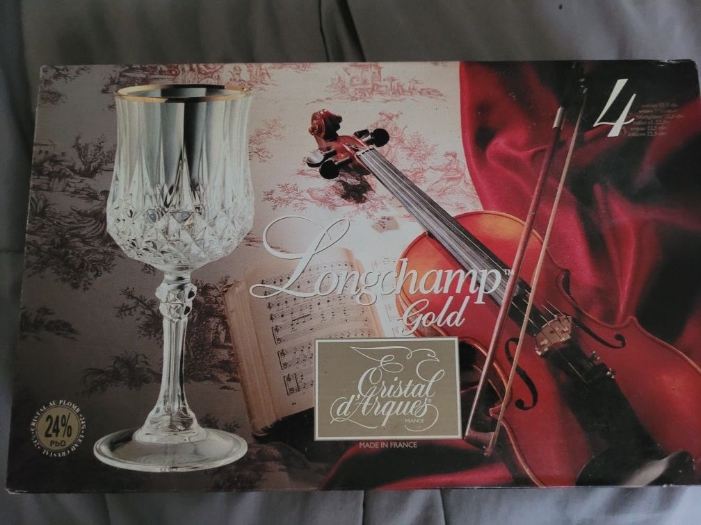 (4) Longchamp Gold Rimmed Crystal Wine Glasses - New In Box