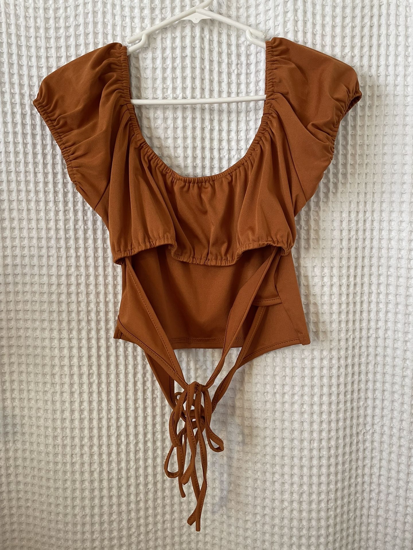 Orange crop top with two ties in front under breast area and sleeves can be work either up or on the side of arms