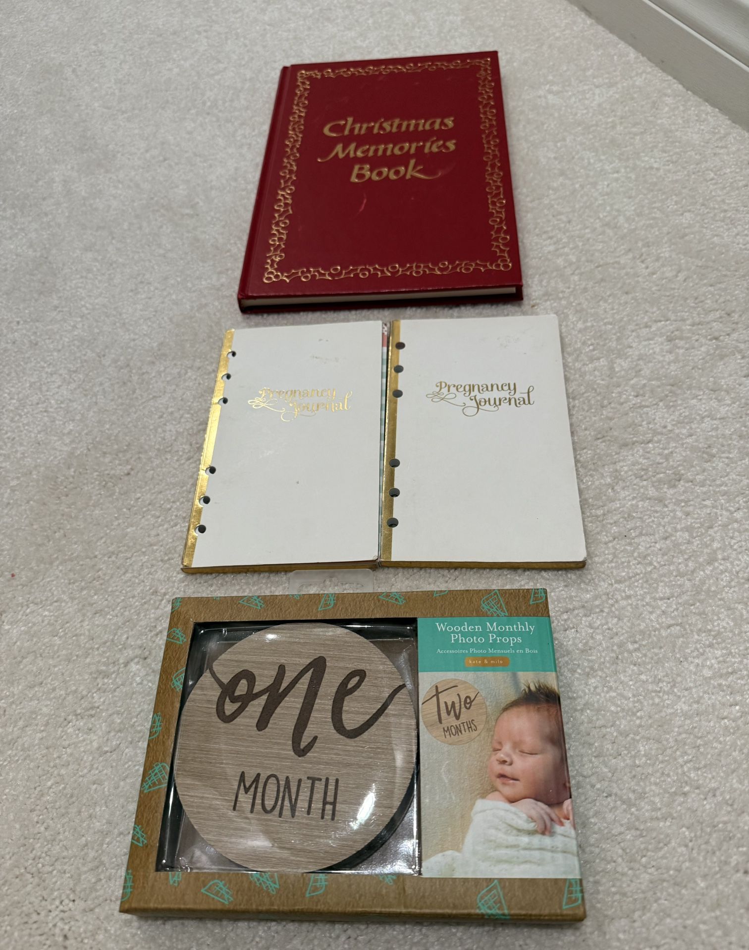 Two pregnancy journals, 1-12 months monthly milestone cards for pictures, Christmas memory book.