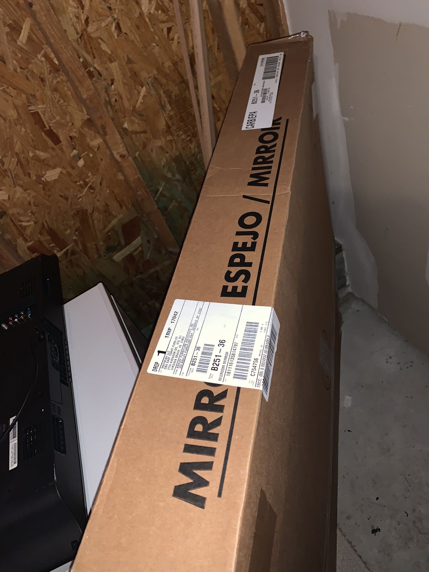Ashley Mirror. Color is grey. I do not know the size because there are no dimensions on the box. 39.80” W x 2.48” D x 32.87” H