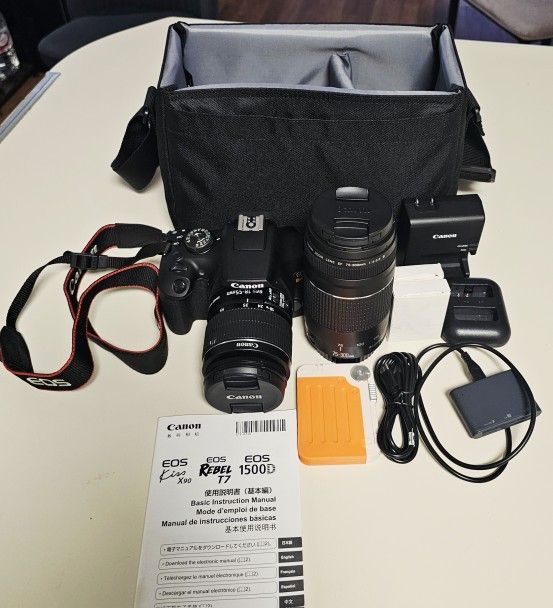 Canon Rebel EOS T7 Digital camera 2 lenses, 75mm and 300mm 606 shutter count 3 batteries Charge dock Link cables 2 256gb memory cards Memory card carry case Card reader pc link cables Camera case Owner manual