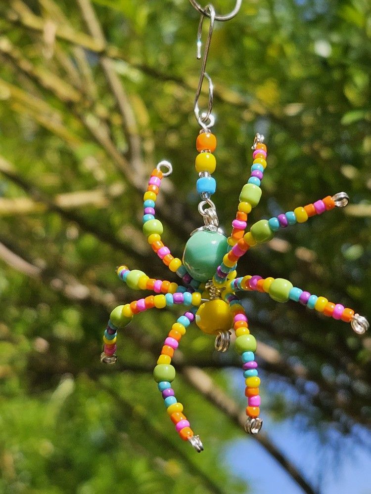 Unique handmade spider. Made with rainbow candy colored beads. Comes with a matching hook and makes a great, unique gift.