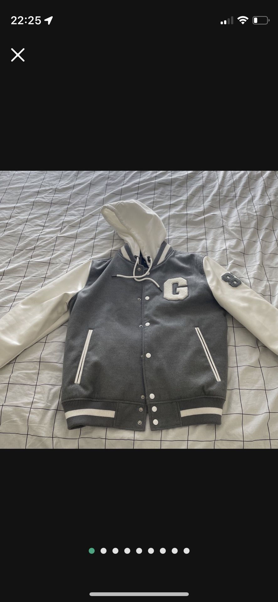 Guess letterman varsity style jacket with removable hood. Very stylish jacket, very clean for a greyscale/white dominant urban/preppy style fit. only worn a couple of times. Size medium, 9.5/10 condition, note marks on right sleeve in pictures