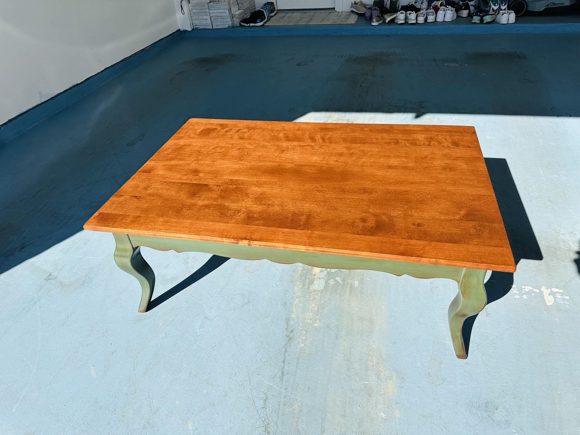 We have a Beautiful Nichols & Stone Traditional Shaker Style Cherry Top Rustic Green Cocktail Coffee Table with screw on legs. Made by Nichols & Stone Furniture Co. The Measurements are: 48" L x 32" W x 17" H. This amazing Nichols & Stone Traditional Shaker Style Cherry Top Cocktail Coffee Table is in great use condition with a few minor scratches on the top surface and top edges also few scratches on the bottom legs area from normal use but nothing that will affect the Quilty. LOCAL PICKUP ONLY!