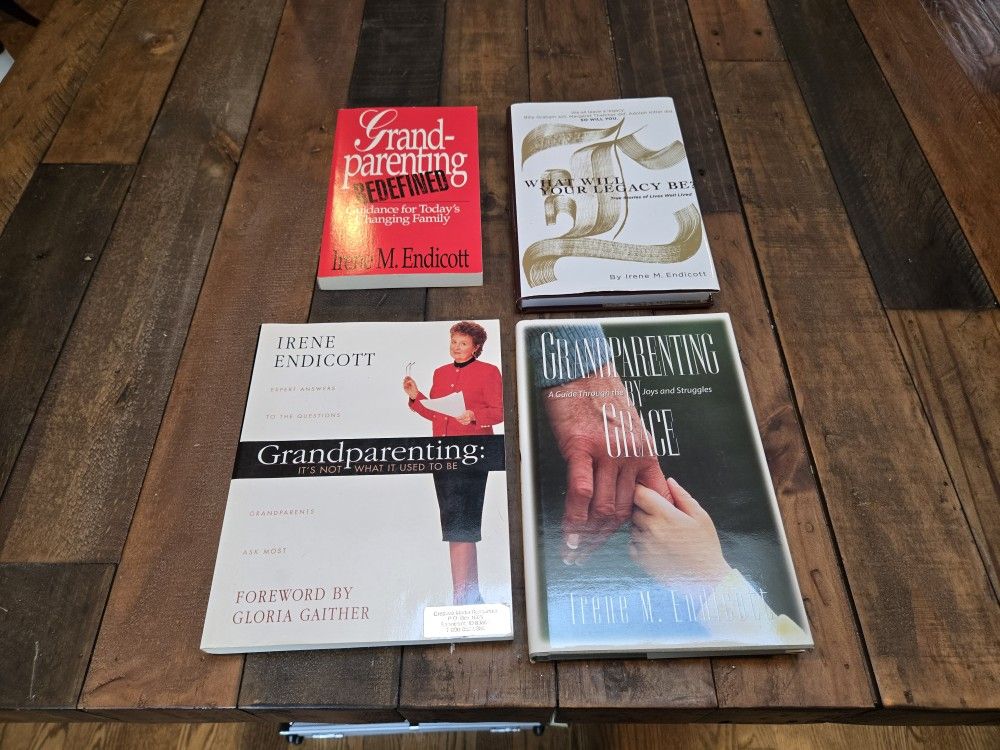 4 books by Irene M. Endicott. Includes Grandparenting Redefined, What Will Your Legacy Be, Grandparenting It's Not What It Used to Be, and Grandparenting by Grace. Great reads for guidance on grandparenting and life. If listed, it's available (please don't ask). Cash only. Please click for other items I'm selling. Bundle pricing.