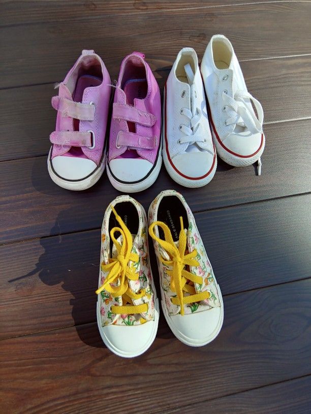 Size 10 toddler Converse bundle. Pink they are adding free we tie-dyed them. White VGUC, could use a light cleaning, floral pair EUC.