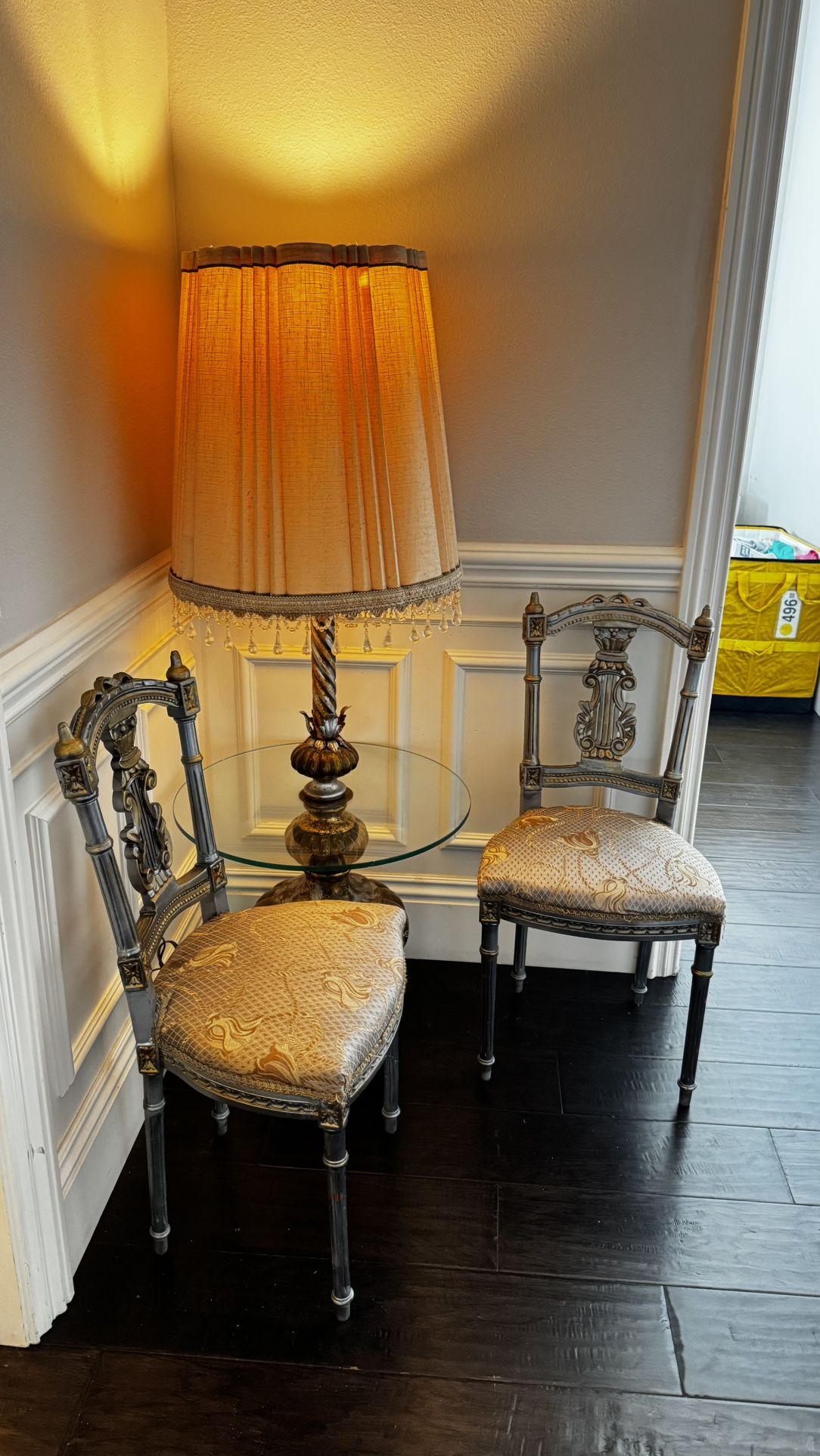 Beautiful vintage-style accent furniture set including: • (2) ornate upholstered chairs • (1) matching glass lamp table • (1) decorative lamp with shade Chairs have an elegant carved frame with patterned upholstery. Lamp table has a solid base and round glass top. Perfect for an entryway, bedroom, or formal living room. Condition: Good overall, some signs of wear from normal use (see photos). From a smoke-free home. Pickup only.