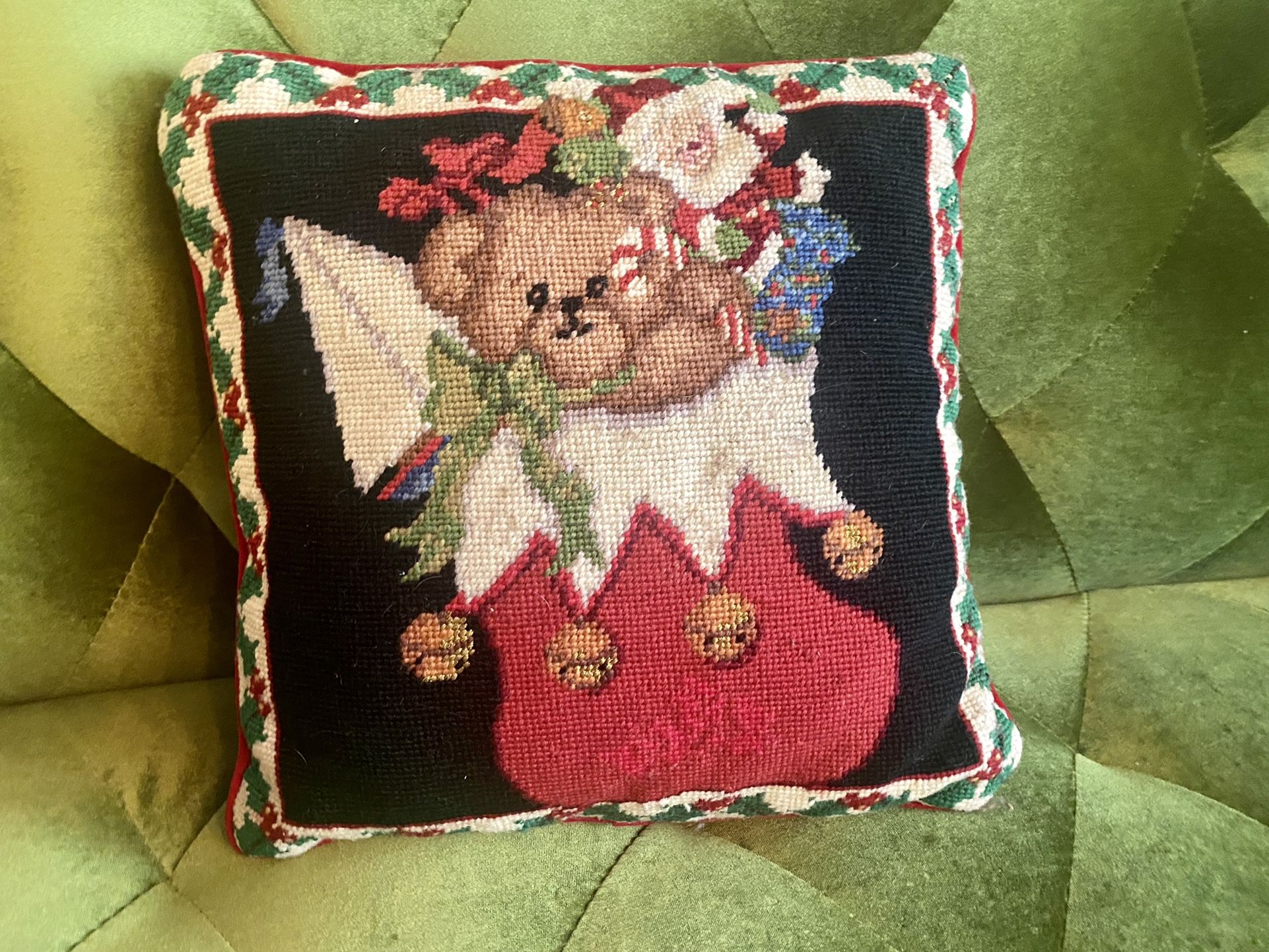 This is in good vintage condition. There is a black mark on the back of the pillow, this is shown in the photos.