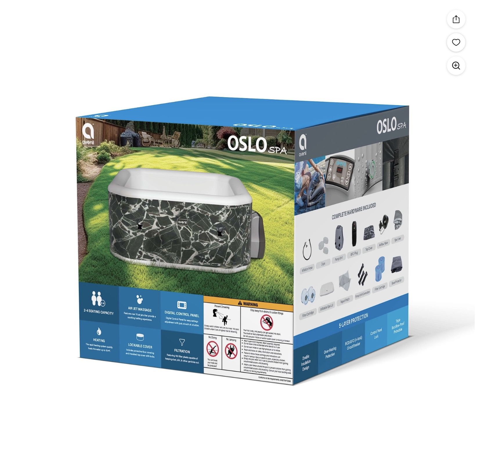 Avenli Oslo 4-Person Inflatable Hot Tub Spa + Cover, Black Marble Pattern, Rapid Heating up to 104°F, Soothing Water Jets, 201 gal, Octagon Item details Avenli Oslo 4-Person Inflatable Hot Tub Spa + Cover Enjoy total relaxation in your own backyard with the Avenli Oslo 2-4 Person Octagon-shaped inflatable hot tub bubble spa. The spa inflates in minutes, and the rapid heating system quickly heats the water up to 104 degrees, perfect for soothing sore muscles or lounging after a long day. With the touch of a button, activate the 70 soothing water jets that surround the interior of the spa or adjust the temperature that best suits your comfort level. The 2-4 person capacity is perfect for a smaller group gathering. Engineered for exceptional strength and long-lasting durability, the Avenli hot tub features 20 cm Ultra-Rigid Drop Stitch Technology, ensuring superior stability and support. The spa includes a reinforced cover with safety lock clips, an insulated floor protector, a drop-stitch spa liner, a spa pump (110-120V), and two anti-bacterial filtration cartridges. The grounding test system and waterproof PCB add safety and durability, making this spa the perfect choice for relaxation and small gatherings. Unwind after a long day with the Avenli Oslo Inflatable Hot Tub Bubble Spa, offering a soothing water massage in the comfort of your backyard, perfect for year-round relaxation and convenience. Inflatable Hot Tub Bubble Spa: Designed to comfortably accommodate 2-4 people, perfect for relaxation and socializing. • 20 cm Ultra-Rigid Drop Stitch Technology: Engineered for exceptional strength and long-lasting durability. • Soothing Water Jets: 70 bubble jets deliver a gentle, massaging effect for enhanced comfort and relaxation. • Digitally Controlled Pump: User-friendly control system for convenient operation and adjustments. • Efficient Filtration: Featuring 150 filter pleats capable of keeping dust, dirt and other particles out of your spa. Filter and filter cartridge are conveniently located in the back pocket for easy access and maintenance. • Temperature Control: Maximum heating capacity of 40°C / 104°F for a relaxing spa experience. • Anti-Freeze Automatic Heating: Prevents water from freezing, protecting the spa during cold weather. • Grounding Test System: Automatically detects and informs users if the grounding wire is properly connected for enhanced safety. • Waterproof PCB: Ensures durability and protection from water exposure. • Reinforced Cover: Equipped with safety lock clips for secure coverage and additional safety. • Included Filters: Designed to keep spa water cleaner by inhibiting bacterial growth, ensuring a more hygienic spa experience. • Stylish Design: Modern black marble pattern for a modern and elegant look.