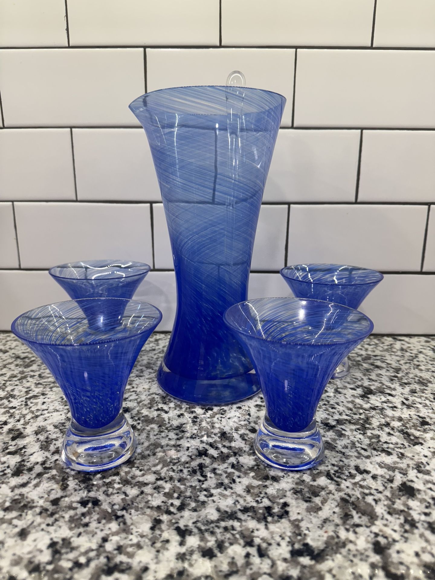Beautiful blue glass cocktail pitcher, stirrer and 4 glasses. The blue twists around the pieces give it a unique look. Heavy bases. Beautifully well shaped and great addition to and bar!