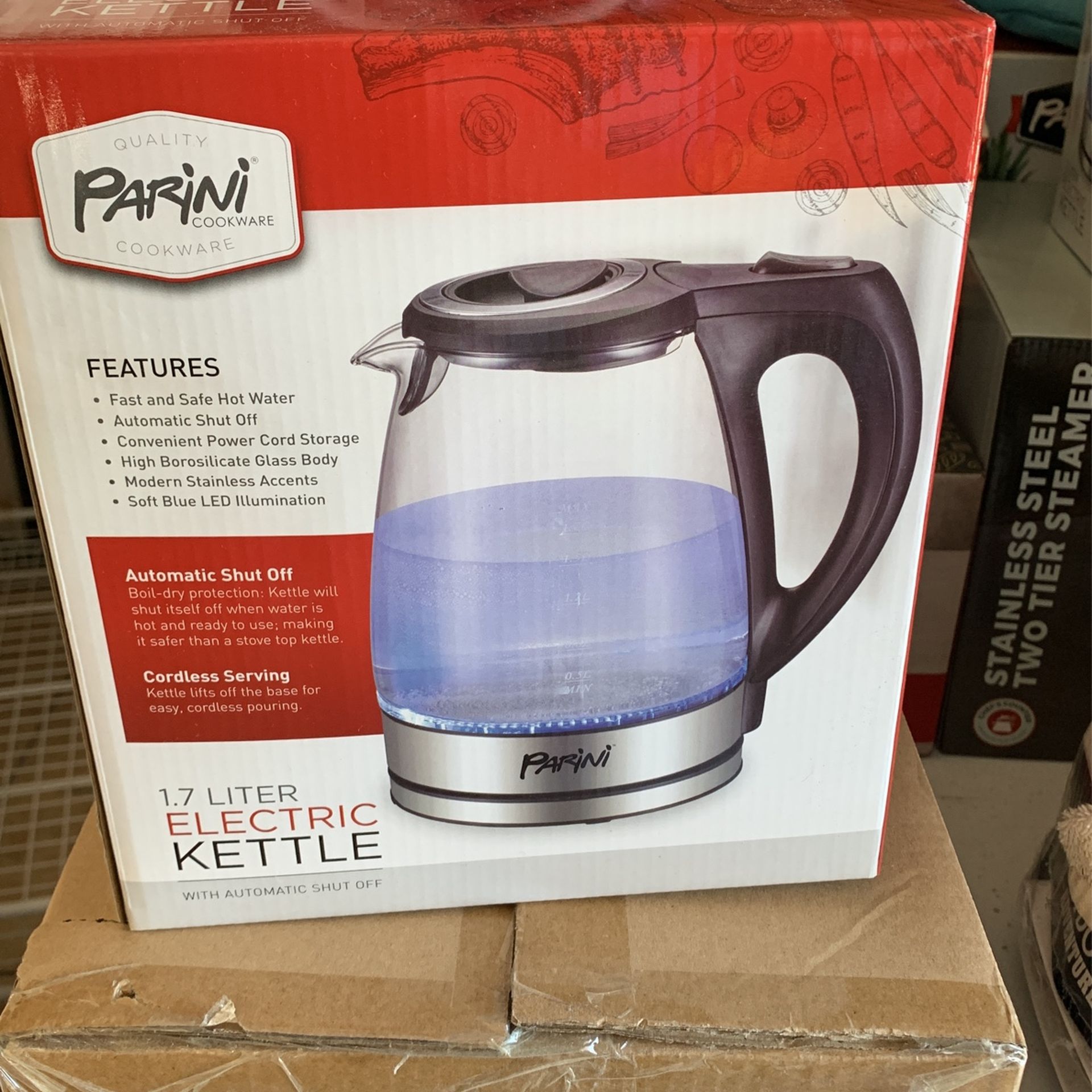 Fast and hot water automatic shut off ,power cord storage, glass body modern stainless steel accents, soft blue led illlumination