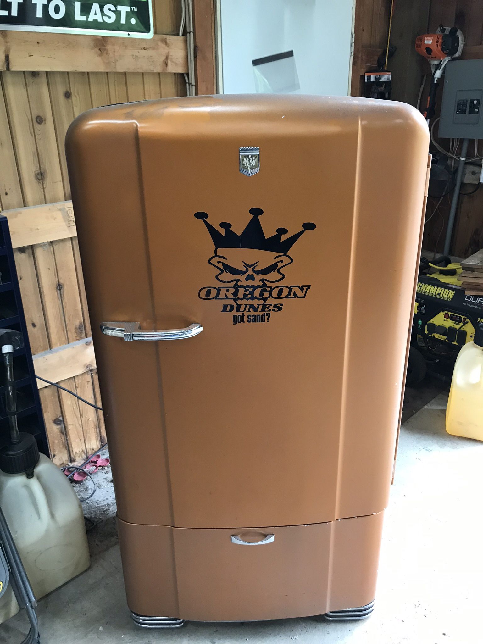 Vintage Maytag fridge that has been repainted in a copper metallic may need a new compressor or re wired cool old fridge but stopped working dune king sticker has been removed and could use a cleaning it’s the shop beer fridge so it gotten a bit dusty