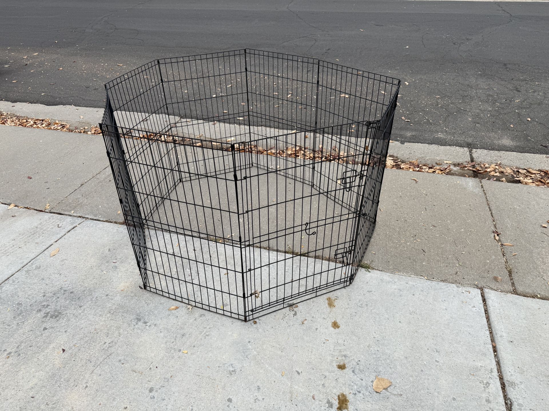 We have a mobile fencing / pet exercise pen that we don’t use anymore. It is 8 panels. Each is 36 inches tall, and 24 inches wide. In the octagon pattern is measure about 60 inches across. Message if interested.