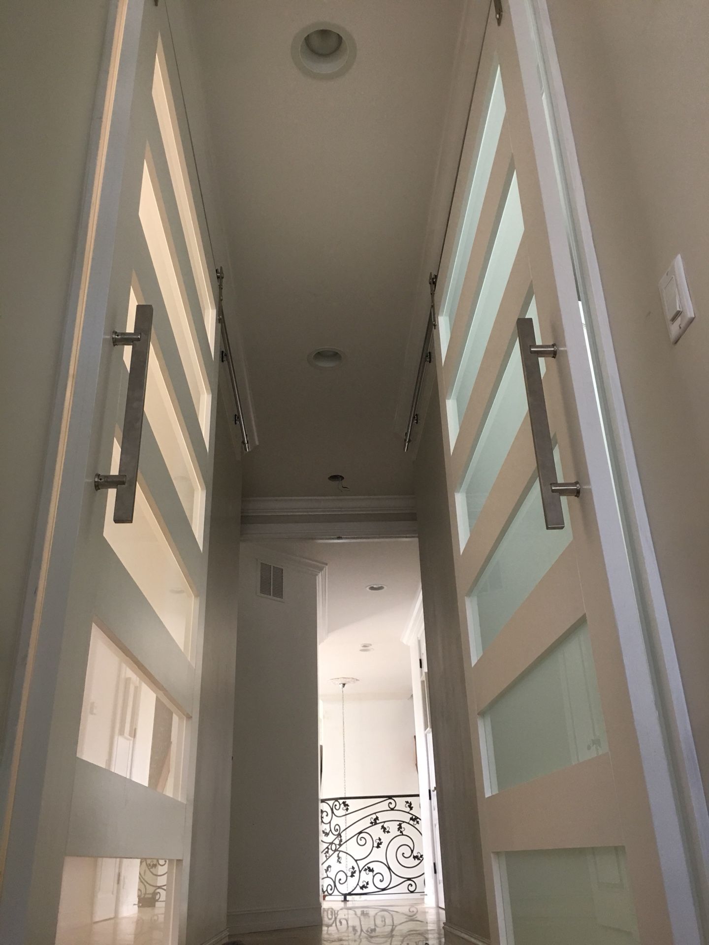 All inclusive Handcrafted barn doors. Price includes color options, all fabrication materials, sliding hardware, and custom fabrication and installation. Upgrades also available on specialty glass, exotic woods, and hardware options.