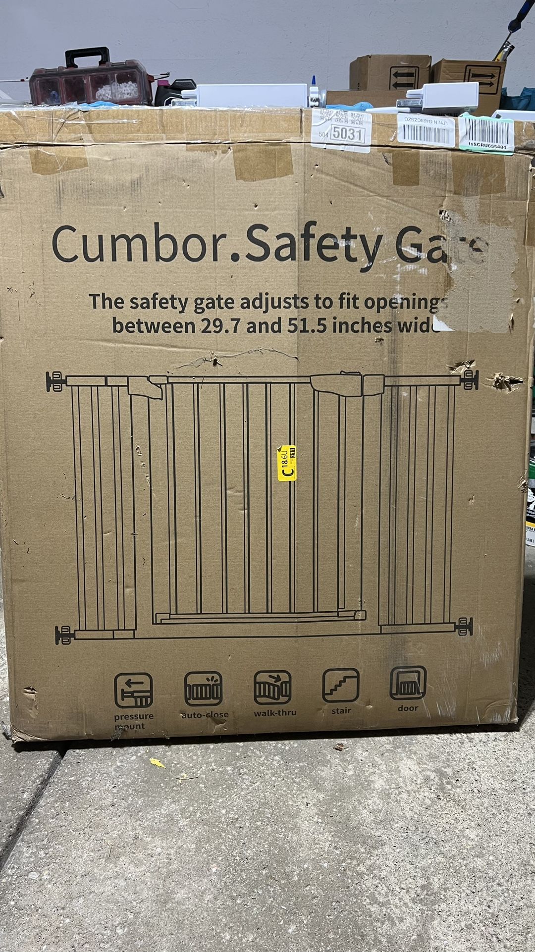 Cumbor safety gate. The safety gate adjusts to fit openings between 29.7 and 51.5 inches wide. Used but looks nice. (Used for baby on stairs)