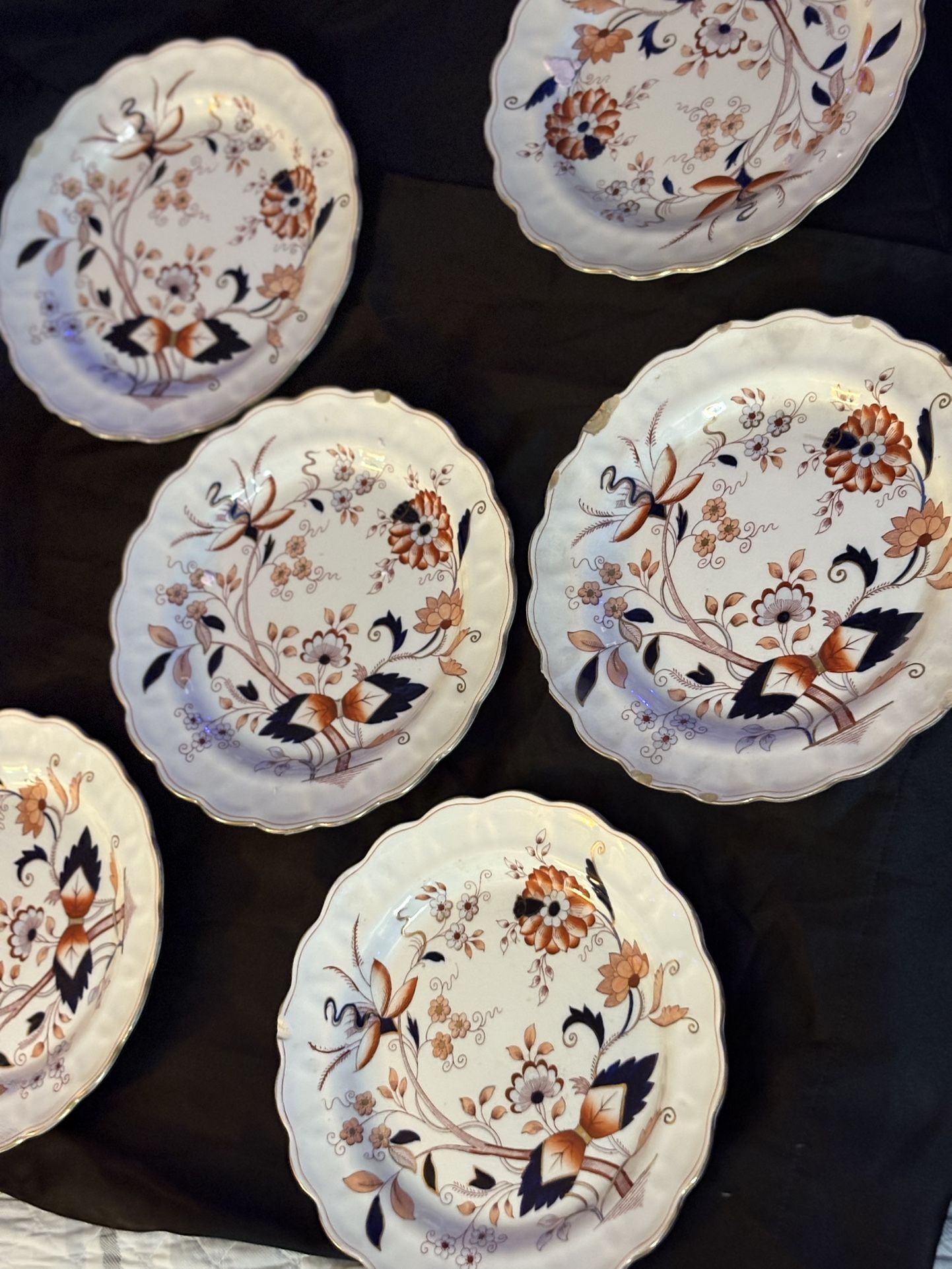 Scarce set of 6 dinner plates by Booths in the Fresian Pattern, No A8022 с. 1 The pattern features a transfer printed Imari floral with hand-painted orange, cobalt blue, light blue and gold accents. Back is stamped with the stamp crown above Booths Made in England Fresian A8022. Each measure 9 and 7/8ths in diameter. Each plate does have a chip or 2 but can be repaired if desired. A fine addition to any collection! Selling $100 for the set or $20 per plate eBay ad for plates in better condition show their value .