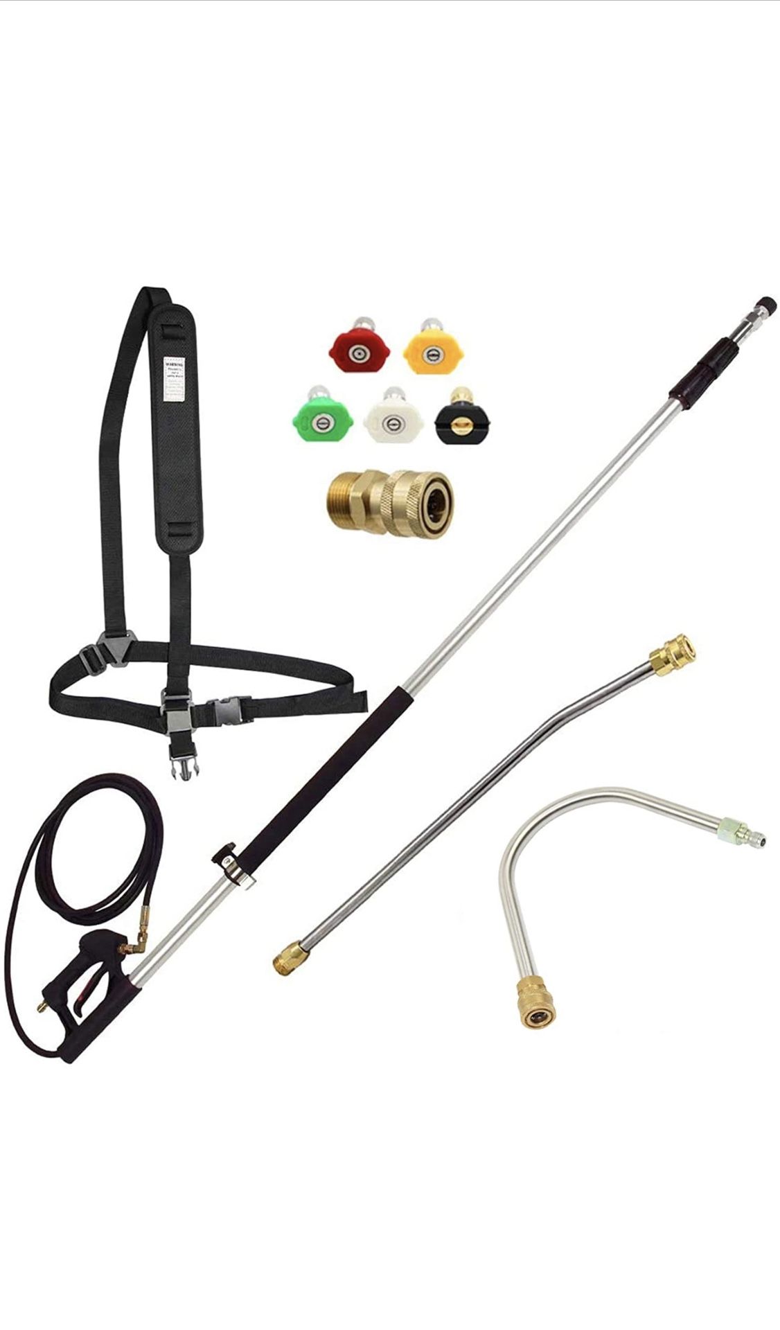 DetailsDetails Material Aluminum Brand Biswing Item Dimensions LxWxH 78 x 8 x 2.5 inches Exterior Finish Stainless Steel, Brass About this item PACKAGE INCLUDES: 1 x telescoping pressure washer wand, 1 x belt, 1 x 20 Inch pressure washer extension gutter cleaner with 1/4" fitting, 1 x Gutter cleaner attachment, 1 x 3/8" quick connect to male M22-14 Adaptor and 5 x nozzle tips. EASY TO USE: Comes with 20 Inch pressure washer gutter cleaner with 1/4" stainless steel quick connect outlet fitting and 1/4" brass quick coupler. Also includes 3/8" QD to M22-14 coupler, if needed, please connect this brass coupler to 3/8" fitting to convert to M22-14. HIGH QUALITY: Telescoping pressure washer wand made of durable aluminum, stainless steel and brass, could extend from 6ft to 18ft. Universal works with many gas-powered and electric pressure washers up to 4000 PSI. WIDELY OCCASION: Great to clean the driveway, sidewalk, pool deck, pool yard, porch, patio. With telescoping wand support harness could help to reduces strain on your neck, back and arms. 5 NOZZLE TIPS: Bonus 0°, 15°, 25°, 40° and soap nozzle. These different angles jet nozzle tips meet your need in different situations, such as washing roof, washing car, washing fence, washing deck.