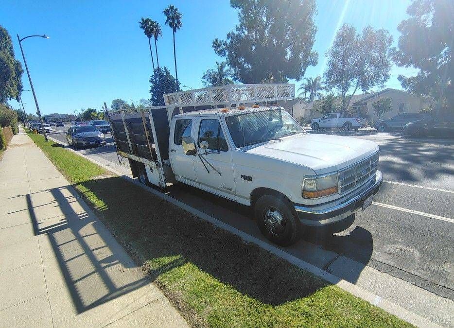 1996 Ford F350 Crew Cab Truck with hydraulic lift gate power windows and doors air conditioner 10 ft bed ladder rack side tool boxes towing hitch hydraulic liftgate automatic transmission clean title Smog Check Ready Tags 2027 $4500 firm no less