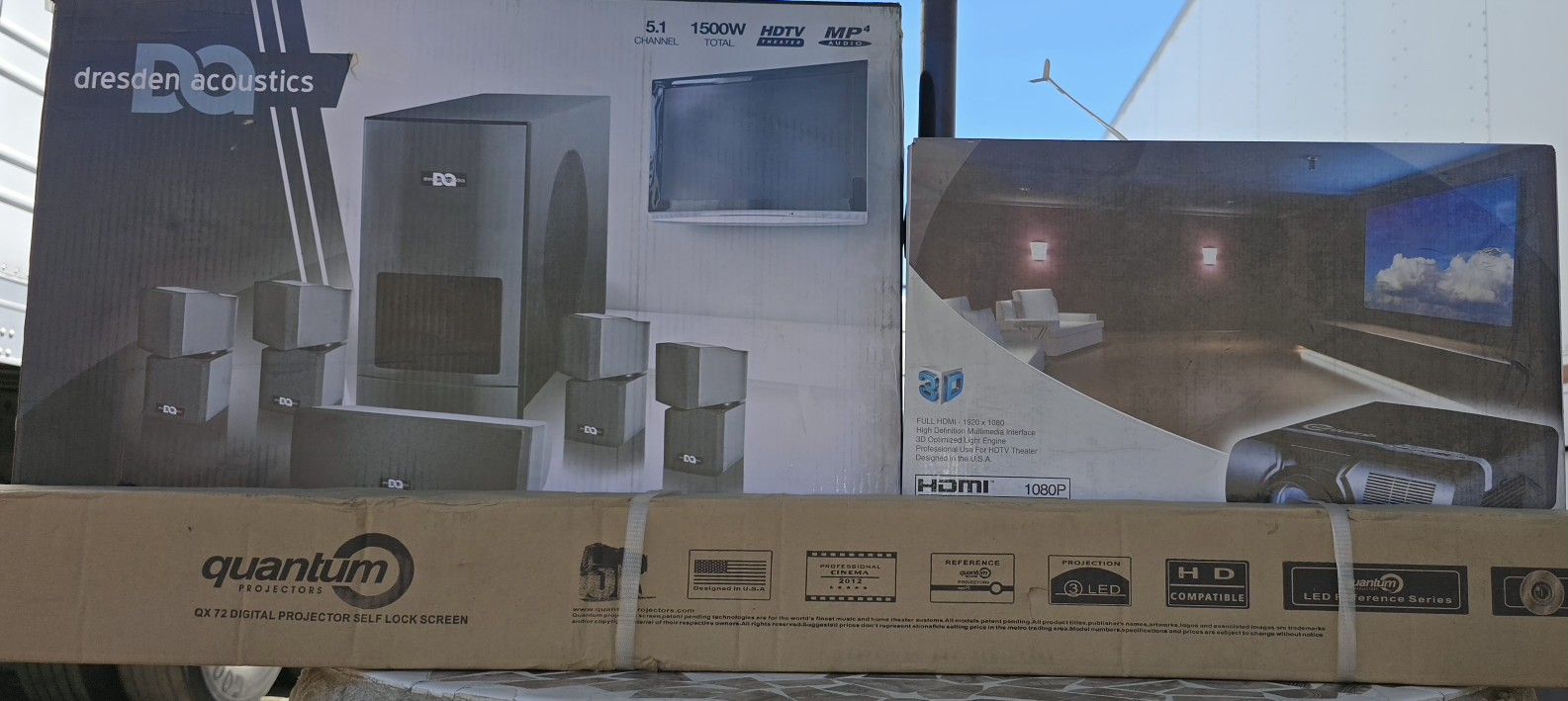 Complete home theater bundle – all brand new, never used, still in box, sold as-is: Quantum QX500 LED Projector (1080P, HDMI, 3D ready) Dresden Acoustics DS-9 5.1 Surround Sound System (Subwoofer, center, and surround speakers) Perfect for movies, gaming, or presentations. Message for details with best price offer. All offer will be consider. If the post is up, it’s still available.