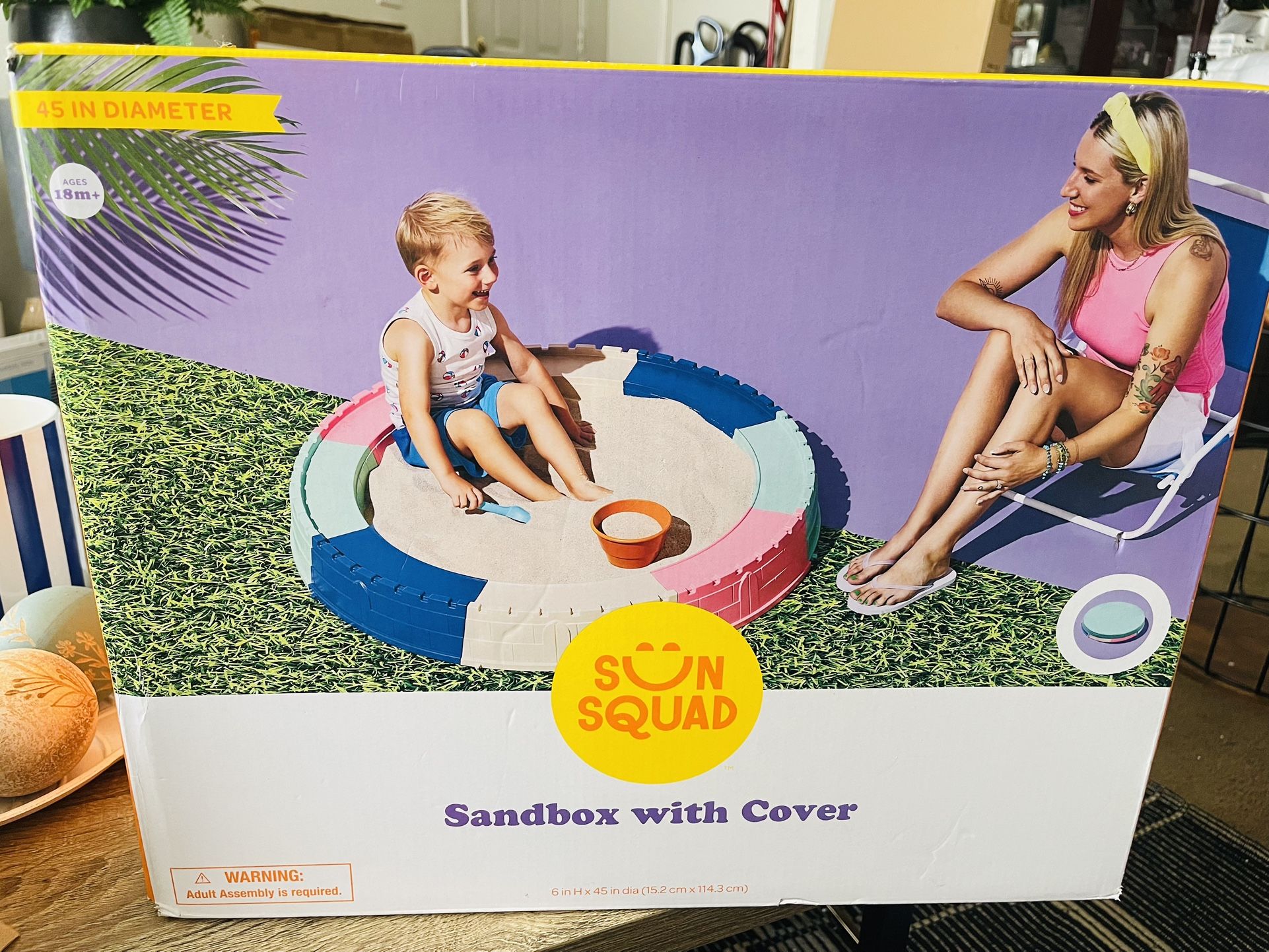 The built-in floor helps keep sand contained and clean. Durable material. It comes with a cover. You can also fill it up with water instead of sand.