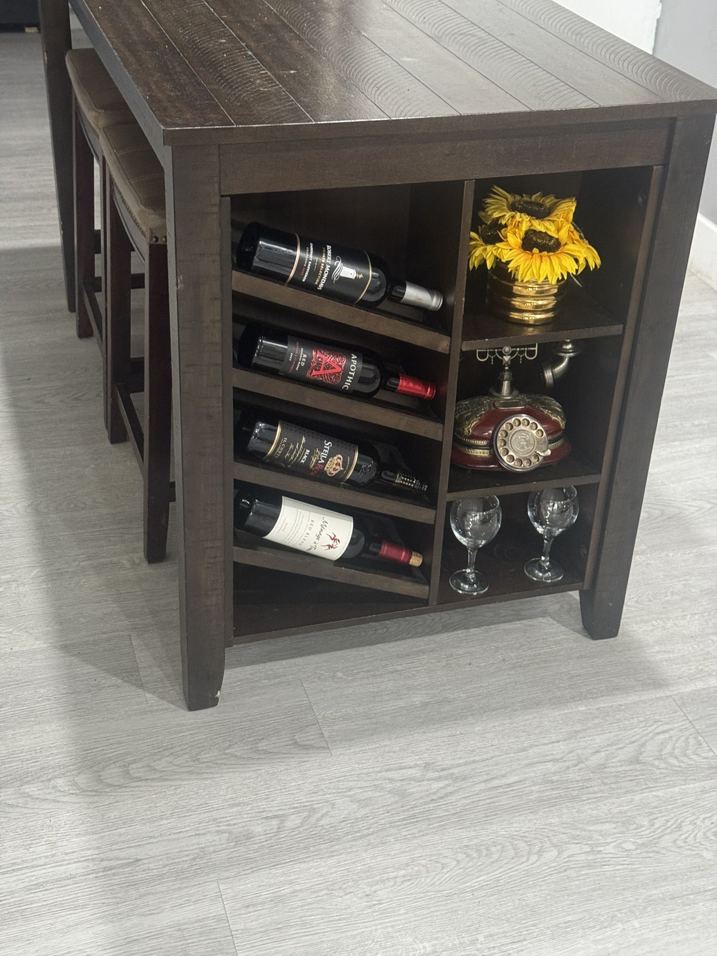 Dining table It’s a bar-height dining table / pub table set. A tall rectangular table: Built-in wine bottle storage on one end 4 matching bar stools tucked underneath Good for small dining areas, kitchens, or entertainment spaces.