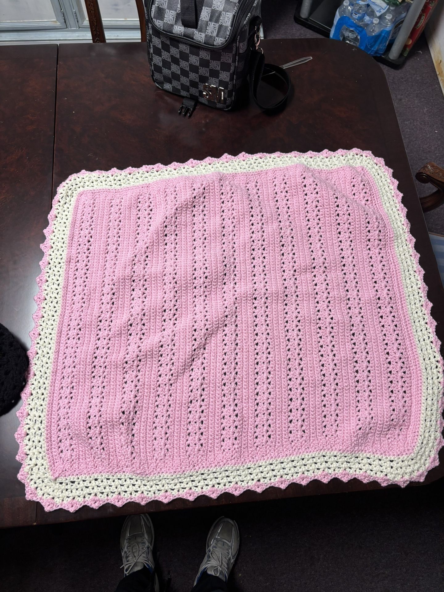 My mom hand crochets a lot of different things and Someone asked my mom to make this baby blanket for a babygirl and when I reached out for pick up I got no response after a few days of courtesy. I have decided to post it anyone in need of a babygirl hand crochet blanket