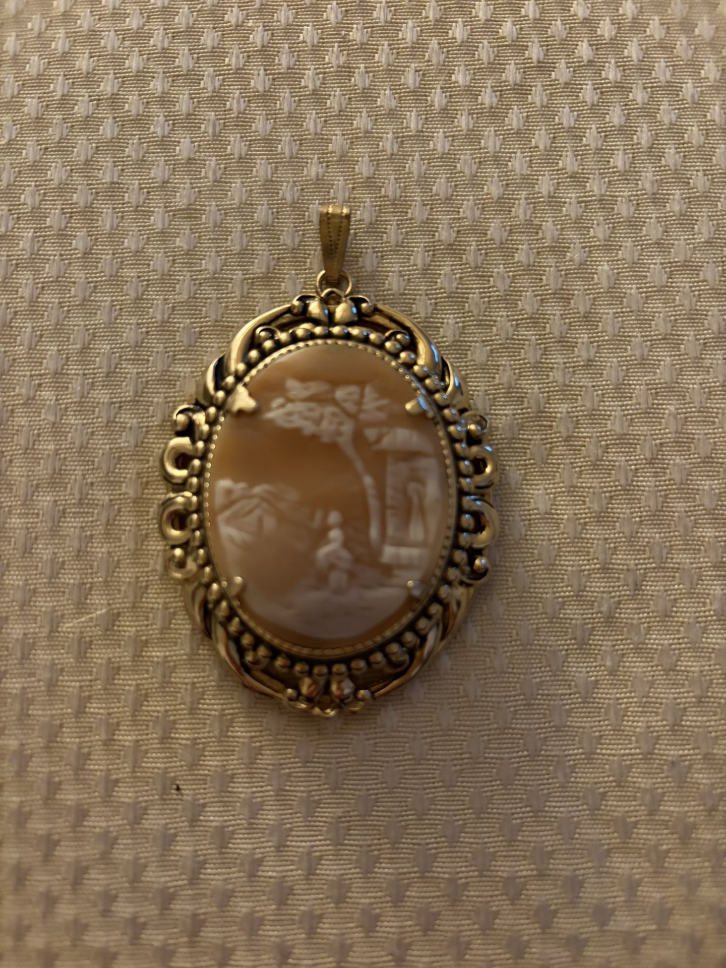 Hand-carved cameo pendants featuring women and landscape, crafted from conch or carnelian
